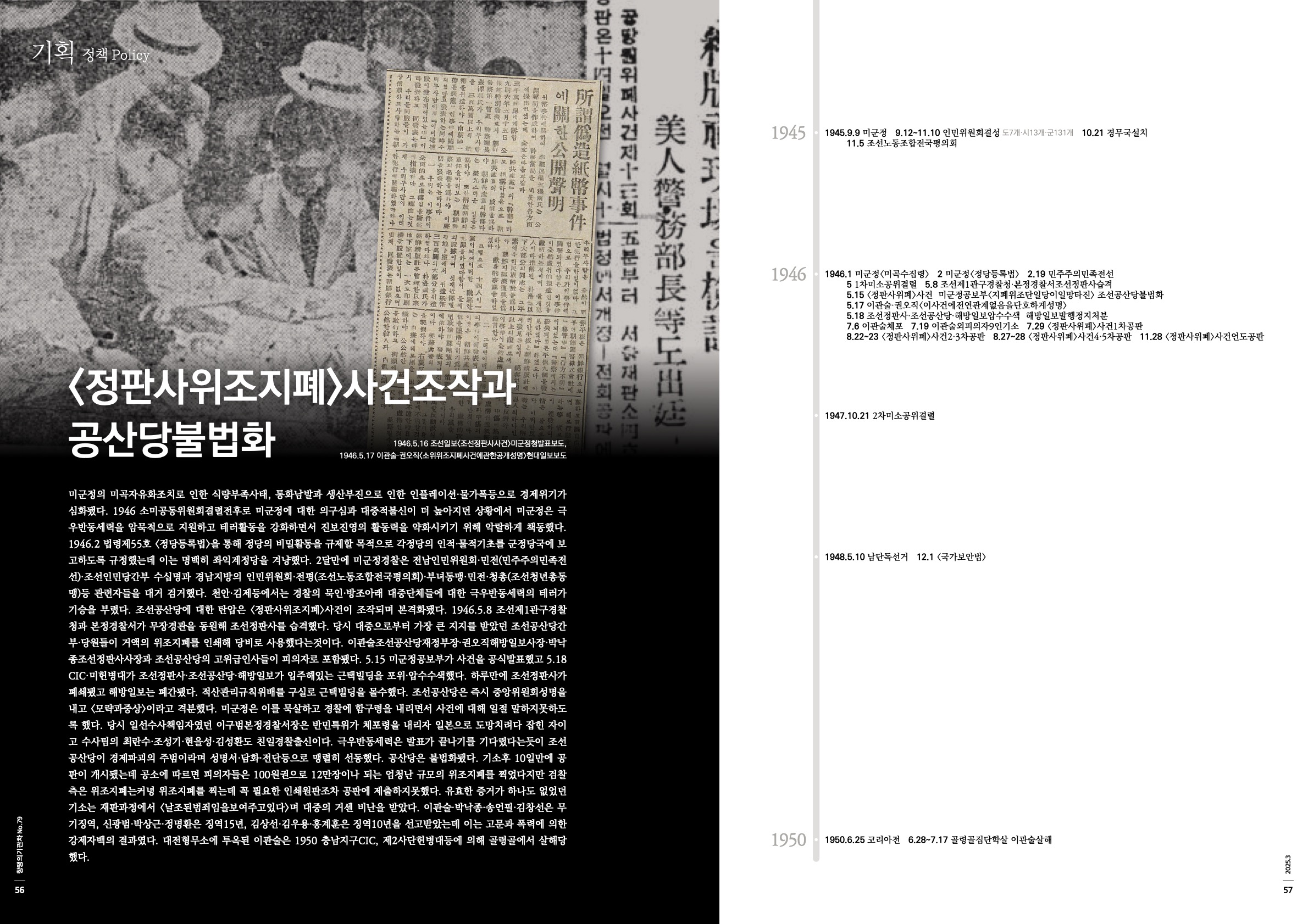 미군정의 미곡자유화조치로 인한 식량부족사태, 통화남발과 생산부진으로 인한 인플레이션·물가폭등으로 경제위기가 심화됐다. 1946 소미공동위원회결렬전후로 미군정에 대한 의구심과 대중적불신이 더 높아지던 상황에서 미군정은 극우반동세력을 암묵적으로 지원하고 테러활동을 강화하면서 진보진영의 활동력을 약화시키기 위해 악랄하게 책동했다. 1946.2 법령제55호 <정당등록법>을 통해 정당의 비밀활동을 규제할 목적으로 각정당의 인적·물적기초를 군정당국에 보고하도록 규정했는데 이는 명백히 좌익계정당을 겨냥했다. 2달만에 미군정경찰은 전남인민위원회·민전(민주주의민족전선)·조선인민당간부 수십명과 경남지방의 인민위원회·전평(조선노동조합전국평의회)·부녀동맹·민전·청총(조선청년총동맹)등 관련자들을 대거 검거했다. 천안·김제등에서는 경찰의 묵인·방조아래 대중단체들에 대한 극우반동세력의 테러가 기승을 부렸다. 조선공산당에 대한 탄압은 <정판사위조지폐>사건이 조작되며 본격화됐다. 1946.5.8 조선제1관구경찰청과 본정경찰서가 무장경관을 동원해 조선정판사를 습격했다. 당시 대중으로부터 가장 큰 지지를 받았던 조선공산당간부·당원들이 거액의 위조지폐를 인쇄해 당비로 사용했다는것이다. 이관술조선공산당재정부장·권오직해방일보사장·박낙종조선정판사사장과 조선공산당의 고위급인사들이 피의자로 포함됐다. 5.15 미군정공보부가 사건을 공식발표했고 5.18 CIC·미헌병대가 조선정판사·조선공산당·해방일보가 입주해있는 근택빌딩을 포위·압수수색했다. 하루만에 조선정판사가 폐쇄됐고 해방일보는 폐간됐다. 적산관리규칙위배를 구실로 근택빌딩을 몰수했다. 조선공산당은 즉시 중앙위원회성명을 내고 <모략과중상>이라고 격분했다. 미군정은 이를 묵살하고 경찰에 함구령을 내리면서 사건에 대해 일절 말하지못하도록 했다. 당시 일선수사책임자였던 이구범본정경찰서장은 반민특위가 체포령을 내리자 일본으로 도망치려다 잡힌 자이고 수사팀의 최란수·조성기·현을성·김성환도 친일경찰출신이다. 극우반동세력은 발표가 끝나기를 기다렸다는듯이 조선공산당이 경제파괴의 주범이라며 성명서·담화·전단등으로 맹렬히 선동했다. 공산당은 불법화됐다. 기소후 10일만에 공판이 개시됐는데 공소에 따르면 피의자들은 100원권으로 12만장이나 되는 엄청난 규모의 위조지폐를 찍었다지만 검찰측은 위조지폐는커녕 위조지폐를 찍는데 꼭 필요한 인쇄원판조차 공판에 제출하지못했다. 유효한 증거가 하나도 없었던 기소는 재판과정에서 <날조된범죄임을보여주고있다>며 대중의 거센 비난을 받았다. 이관술·박낙종·송언필·김창선은 무기징역, 신광범·박상근·정명환은 징역15년, 김상선·김우용·홍계훈은 징역10년을 선고받았는데 이는 고문과 폭력에 의한 강제자백의 결과였다. 대전형무소에 투옥된 이관술은 1950 충남지구CIC, 제2사단헌병대등에 의해 골령골에서 살해당했다.