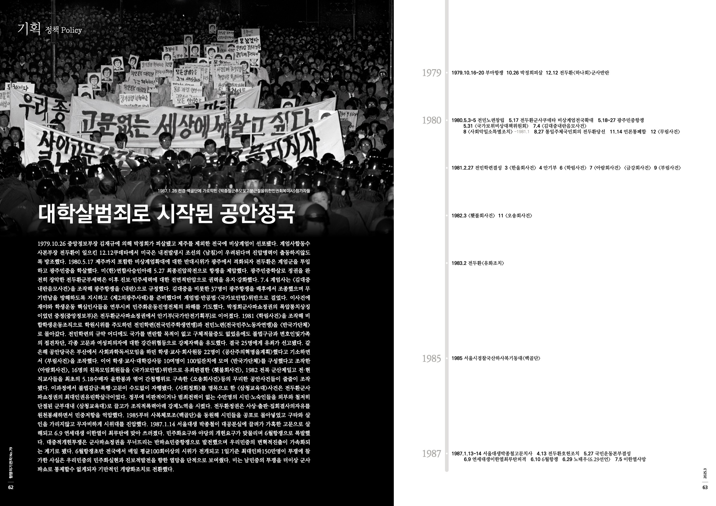 1979.10.26 중앙정보부장 김재규에 의해 박정희가 피살됐고 제주를 제외한 전국에 비상계엄이 선포됐다. 계엄사합동수사본부장 전두환이 일으킨 12.12쿠데타에서 미국은 내전발생시 조선의 <남침>이 우려된다며 진압병력이 출동하지않도록 방조했다. 1980.5.17 제주까지 포함한 비상계엄확대에 대한 반대시위가 광주에서 격화되자 전두환은 계엄군을 투입하고 광주민중을 학살했다. 미<한>연합사승인아래 5.27 최종진압작전으로 항쟁을 제압했다. 광주민중학살로 정권을 완전히 장악한 전두환군부세력은 이후 진보·민주세력에 대한 전면적탄압으로 권력을 유지·강화했다. 7.4 계엄사는 <김대중내란음모사건>을 조작해 광주항쟁을 <내란>으로 규정했다. 김대중을 비롯한 37명이 광주항쟁을 배후에서 조종했으며 무기반납을 방해하도록 지시하고 <제2의광주사태>를 준비했다며 계엄법·반공법·<국가보안법>위반으로 걸었다. 이사건에 재야와 학생운동 핵심인사들을 연루시켜 민주화운동진영전체의 와해를 기도했다. 박정희군사파쇼정권의 폭압통치상징이었던 중정(중앙정보부)은 전두환군사파쇼정권에서 안기부(국가안전기획부)로 이어졌다. 1981 <학림사건>을 조작해 비합학생운동조직으로 학원시위를 주도하던 전민학련(전국민주학생연맹)과 전민노련(전국민주노동자연맹)을 <반국가단체>로 몰아갔다. 전민학련의 규약 어디에도 국가를 변란할 목적이 없고 구체적물증도 없었음에도 불법구금과 변호인및가족의 접견차단, 각종 고문과 여성피의자에 대한 강간위협등으로 강제자백을 유도했다. 결국 25명에게 유죄가 선고됐다. 같은해 공안당국은 부산에서 사회과학독서모임을 하던 학생·교사·회사원등 22명이 <공산주의혁명을계획>했다고 기소하면서 <부림사건>을 조작했다. 이어 학생·교사·대학강사등 10여명이 100일잔치에 모여 <반국가단체>를 구성했다고 조작한 <아람회사건>, 16명의 친목모임회원들을 <국가보안법>위반으로 유죄판결한 <횃불회사건>, 1982 전북 군산제일고 전·현직교사들을 최초의 5.18수배자 윤한봉과 엮어 간첩행위로 구속한 <오송회사건>등의 무리한 공안사건들이 줄줄이 조작됐다. 이과정에서 불법감금·폭행·고문이 수도없이 자행됐다. <사회정화>를 명목으로 한 <삼청교육대>사건은 전두환군사파쇼정권의 최대인권유린학살극이었다. 정부에 비판적이거나 범죄전력이 없는 수만명의 시민·노숙인들을 외부와 철저히 단절된 군부대내 <삼청교육대>로 끌고가 조직적폭력아래 강제노역을 시켰다. 전두환정권은 사상·출판·집회결사의자유를 원천봉쇄하면서 민중저항을 억압했다. 1985부터 사복체포조<백골단>을 동원해 시민들을 공포로 몰아넣었고 구타와 살인을 가리지않고 무자비하게 시위대를 진압했다. 1987.1.14 서울대생 박종철이 대공분실에 끌려가 가혹한 고문으로 살해되고 6.9 연세대생 이한열이 최루탄에 맞아 쓰러졌다. 민주화요구와 야당의 개헌요구가 맞물리며 6월항쟁으로 폭발했다. 대중적개헌투쟁은 군사파쇼정권을 무너뜨리는 반파쇼민중항쟁으로 발전했으며 우리민중의 변혁적진출이 가속화되는 계기로 됐다. 6월항쟁초반 전국에서 매일 평균100회이상의 시위가 전개되고 1일기준 최대인파150만명이 투쟁에 참가한 사실은 우리민중의 민주화실현과 진보적발전을 향한 열망을 단적으로 보여줬다. 미는 남민중의 투쟁을 더이상 군사파쇼로 통제할수 없게되자 기만적인 개량화조치로 전환했다.
