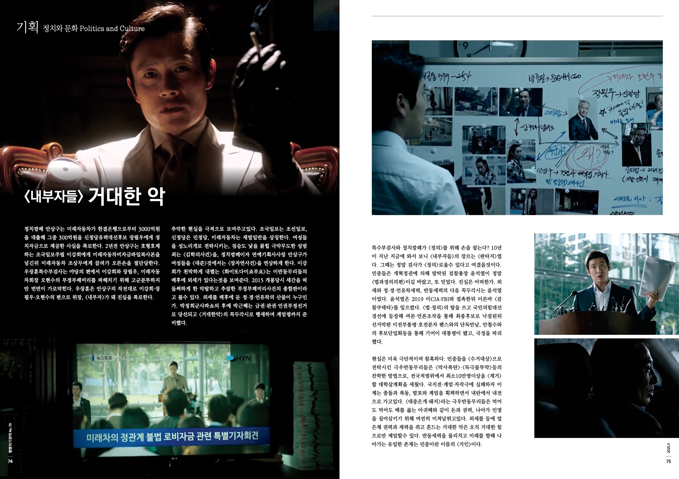 추악한 현실을 극적으로 보여주고있다. 조국일보는 조선일보, 신정당은 민정당, 미래자동차는 재벌일반을 상징한다. 여성들을 성노리개로 전락시키는, 짐승도 낯을 붉힐 극악무도한 성범죄는 <김학의사건>을, 정치깡패이자 연예기획사사장 안상구가 여성들을 <대준>것에서는 <장자연사건>을 연상하게 한다. 이강희가 천박하게 내뱉는 <화이또다이죠부요>는 이반동무리들의 배후에 외세가 있다는것을 보여준다. 2015 개봉당시 세간을 떠들썩하게 한 악랄하고 추잡한 부정부패비리사건의 종합판이라고 볼수 있다. 외세를 배후에 둔 정·경·언유착의 산물이 누구인가. 박정희군사파쇼의 후예 박근혜는 금권·관권·언권부정선거로 당선되고 <거대한악>의 꼭두각시로 행세하며 계엄령까지 준비했다.