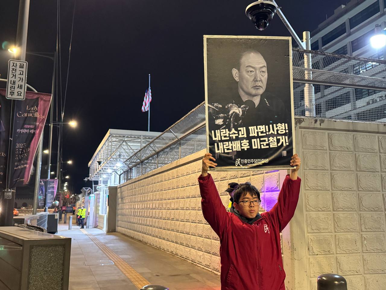 미대사관정문 맞은편에서는 우리말과 영어로 된 구호 <내란수괴 파면!사형! 내란배후 미군철거!>를 들고 <광화문미대사관앞철야시위>를 진행했다. <김병동석방! 내란수괴파면!>, <내란수괴 파면!사형! 내란배후 미군철거!> 구호도 함께 들었다.
