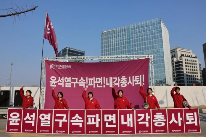 1일 민중민주당(민중당)은 정부청사앞에서 2번째 정당연설회를 열고 헌법재판소의 전원일치를 통한 윤석열파면을 강력히 촉구했다.