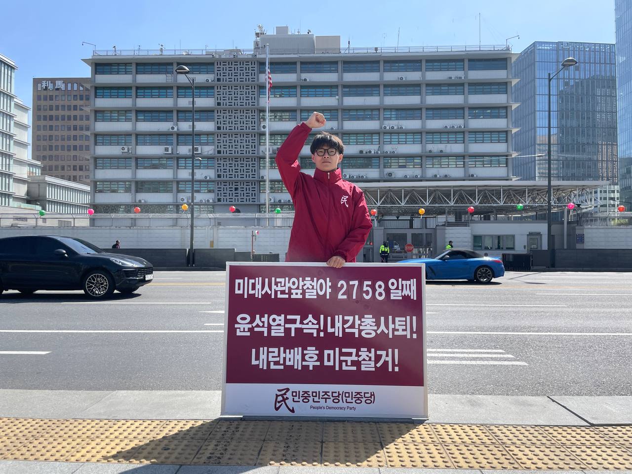 15일 민중민주당(민중당)은 미대사관앞에서 <윤석열구속! 내각총사퇴! 내란배후 미군철거!> 구호를 들고 평화시위를 3191일째 전개했다.