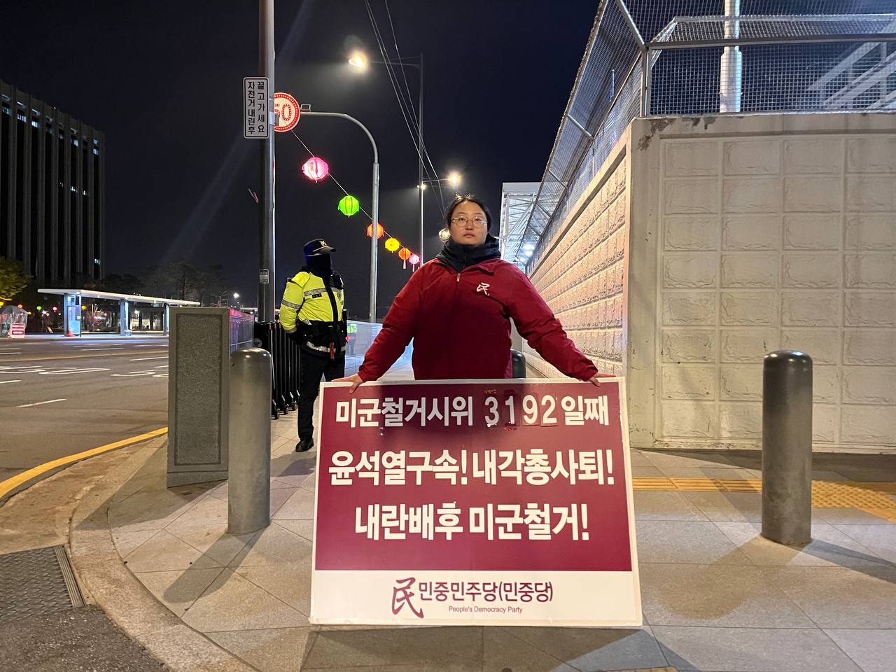 16일 민중민주당(민중당)은 미대사관앞에서 <윤석열구속! 내각총사퇴! 내란배후 미군철거!> 구호를 들고 평화시위를 3192일째 전개했다.