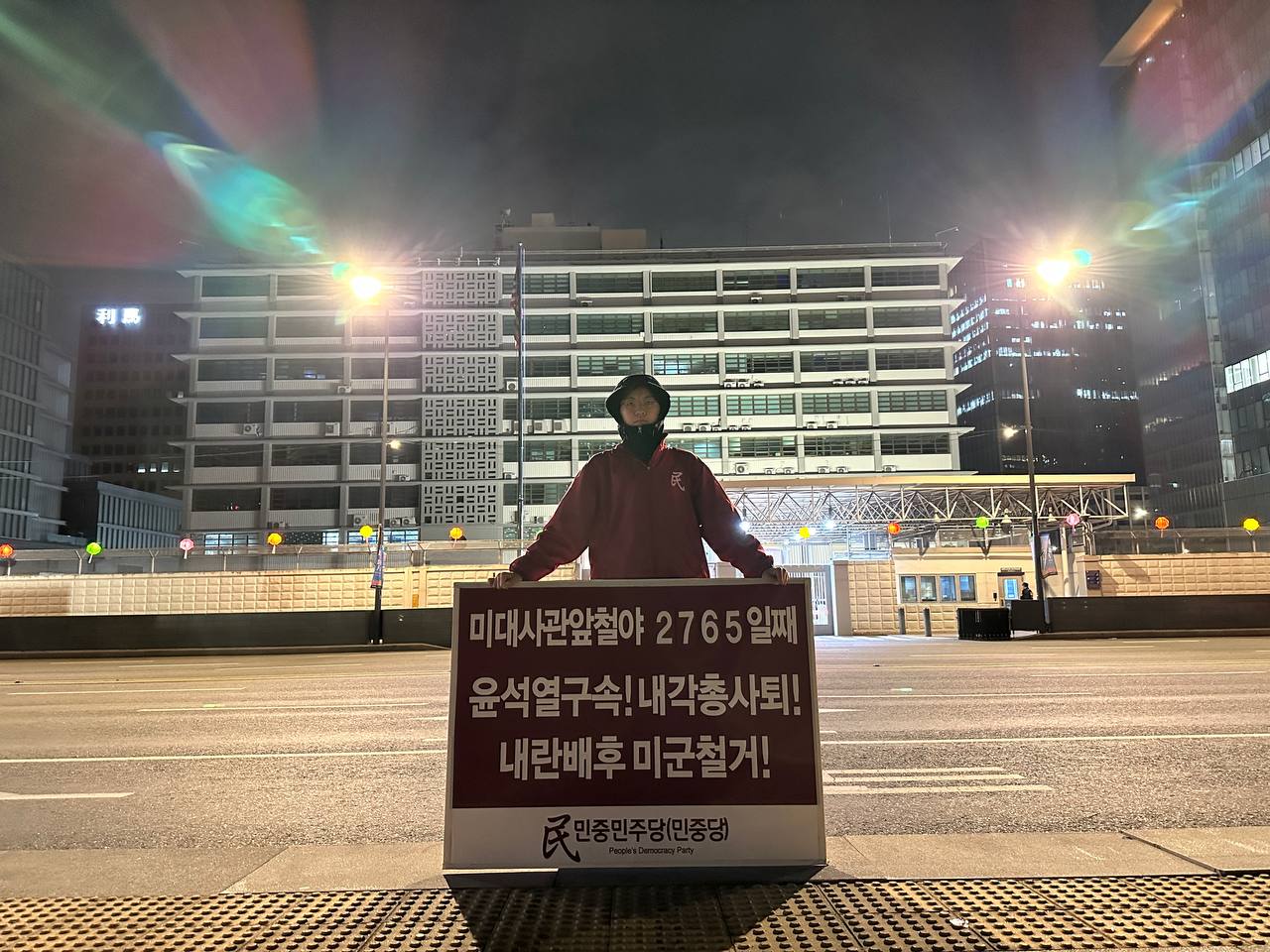 22일 민중민주당(민중당)은 미대사관앞에서 <윤석열구속! 내각총사퇴! 내란배후 미군철거!> 구호를 들고 평화시위를 3198일째 전개했다.