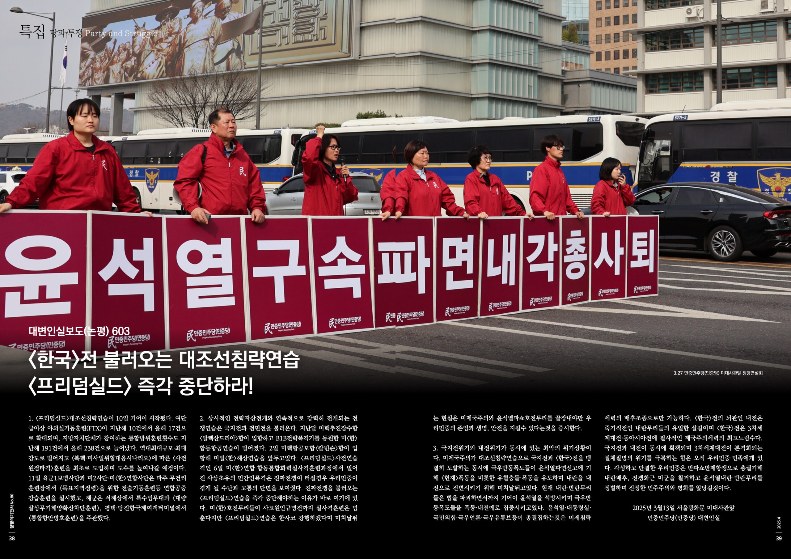 3. 국지전위기와 내전위기가 동시에 있는 최악의 위기상황이다. 미제국주의가 대조선침략연습으로 국지전과 <한국>전을 맹렬히 도발하는 동시에 극우반동폭도들이 윤석열파면선고에 기해 <헌재>폭동을 비롯한 유혈충돌·폭동을 유도하며 내란을 내전으로 전변시키기 위해 미쳐날뛰고있다. 현재 내란·반란무리들은 법을 파괴하면서까지 기어이 윤석열을 석방시키며 극우반동폭도들을 폭동·내전에로 집중시키고있다. 윤석열·대통령실·국민의힘·극우언론·극우유튜브등이 총결집하는것은 미제침략세력의 배후조종으로만 가능하다. <한국>전의 뇌관인 내전은 죽기직전인 내란무리들의 유일한 살길이며 <한국>전은 3차세계대전·동아시아전에 필사적인 제국주의세력의 최고노림수다. 국지전과 내전이 동시에 획책되며 3차세계대전이 본격화되는 절체절명의 위기를 극복하는 힘은 오직 우리민중·민족에게 있다. 각성하고 단결한 우리민중은 반파쇼반제항쟁으로 총궐기해 내란배후, 전쟁화근 미군을 철거하고 윤석열내란·반란무리를 징벌하며 진정한 민주주의와 평화를 앞당길것이다.