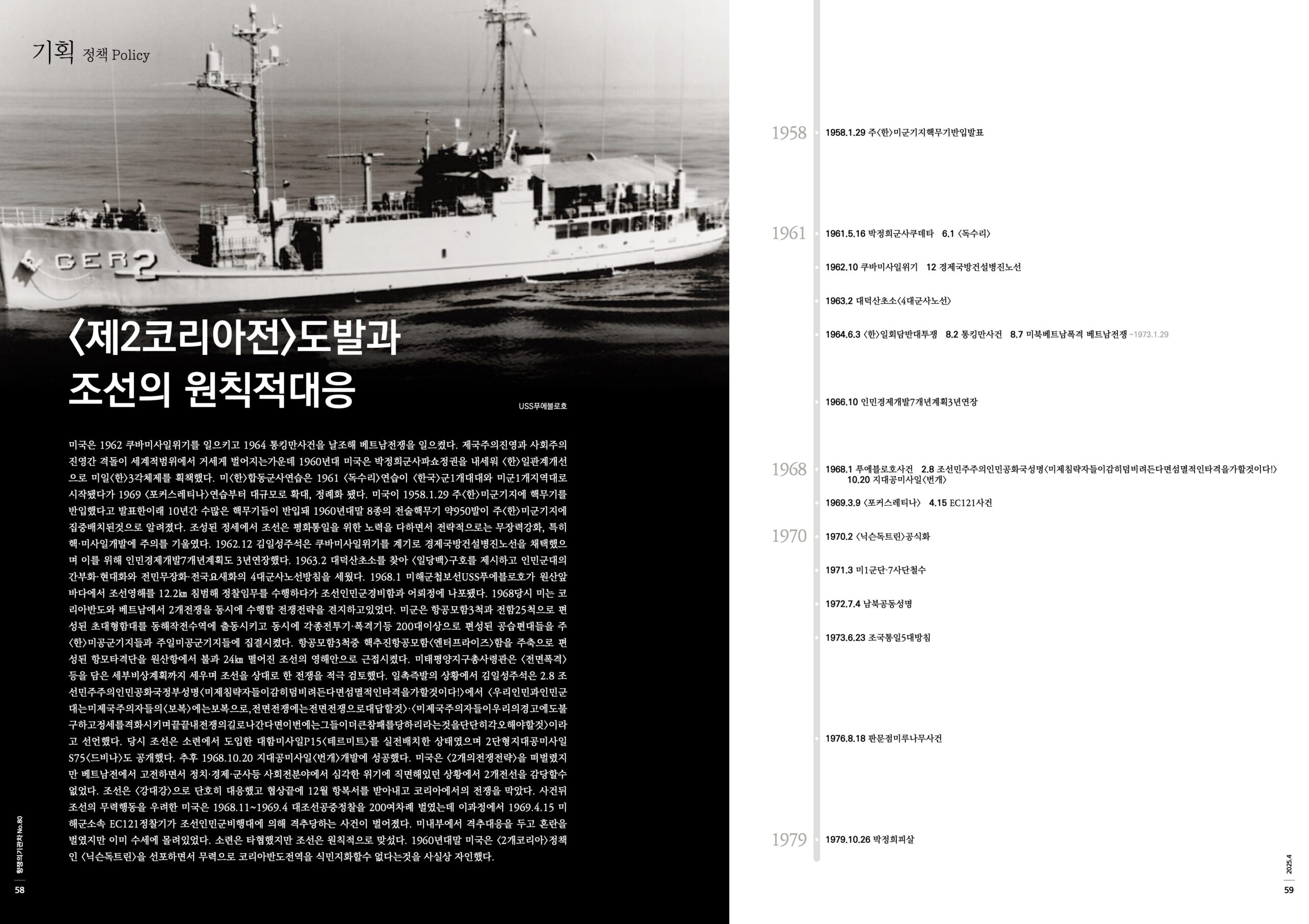 미국은 1962 쿠바미사일위기를 일으키고 1964 통킹만사건을 날조해 베트남전쟁을 일으켰다. 제국주의진영과 사회주의진영간 격돌이 세계적범위에서 거세게 벌어지는가운데 1960년대 미국은 박정희군사파쇼정권을 내세워 <한>일관계개선으로 미일<한>3각체제를 획책했다. 미<한>합동군사연습은 1961 <독수리>연습이 <한국>군1개대대와 미군1개지역대로 시작됐다가 1969 <포커스레티나>연습부터 대규모로 확대, 정례화 됐다. 미국이 1958.1.29 주<한>미군기지에 핵무기를 반입했다고 발표한이래 10년간 수많은 핵무기들이 반입돼 1960년대말 8종의 전술핵무기 약950발이 주<한>미군기지에 집중배치된것으로 알려졌다. 조성된 정세에서 조선은 평화통일을 위한 노력을 다하면서 전략적으로는 무장력강화, 특히 핵·미사일개발에 주의를 기울였다. 1962.12 김일성주석은 쿠바미사일위기를 계기로 경제국방건설병진노선을 채택했으며 이를 위해 인민경제개발7개년계획도 3년연장했다. 1963.2 대덕산초소를 찾아 <일당백>구호를 제시하고 인민군대의간부화·현대화와 전민무장화·전국요새화의 4대군사노선방침을 세웠다. 1968.1 미해군첩보선USS푸에블로호가 원산앞바다에서 조선영해를 12.2㎞ 침범해 정찰임무를 수행하다가 조선인민군경비함과 어뢰정에 나포됐다. 1968당시 미는 코리아반도와 베트남에서 2개전쟁을 동시에 수행할 전쟁전략을 견지하고있었다. 미군은 항공모함3척과 전함25척으로 편성된 초대형함대를 동해작전수역에 출동시키고 동시에 각종전투기·폭격기등 200대이상으로 편성된 공습편대들을 주<한>미공군기지들과 주일미공군기지들에 집결시켰다. 항공모함3척중 핵추진항공모함<엔터프라이즈>함을 주축으로 편성된 항모타격단을 원산항에서 불과 24㎞ 떨어진 조선의 영해안으로 근접시켰다. 미태평양지구총사령관은 <전면폭격>등을 담은 세부비상계획까지 세우며 조선을 상대로 한 전쟁을 적극 검토했다. 일촉즉발의 상황에서 김일성주석은 2.8 조선민주주의인민공화국정부성명<미제침략자들이감히덤비려든다면섬멸적인타격을가할것이다!>에서 <우리인민과인민군대는미제국주의자들의<보복>에는보복으로,전면전쟁에는전면전쟁으로대답할것>·<미제국주의자들이우리의경고에도불구하고정세를격화시키며끝끝내전쟁의길로나간다면이번에는그들이더큰참패를당하리라는것을단단히각오해야할것>이라고 선언했다. 당시 조선은 소련에서 도입한 대함미사일P15<테르미트>를 실전배치한 상태였으며 2단형지대공미사일S75<드비나>도 공개했다. 추후 1968.10.20 지대공미사일<번개>개발에 성공했다. 미국은 <2개의전쟁전략>을 떠벌렸지만 베트남전에서 고전하면서 정치·경제·군사등 사회전분야에서 심각한 위기에 직면해있던 상황에서 2개전선을 감당할수 없었다. 조선은 <강대강>으로 단호히 대응했고 협상끝에 12월 항복서를 받아내고 코리아에서의 전쟁을 막았다. 사건뒤 조선의 무력행동을 우려한 미국은 1968.11~1969.4 대조선공중정찰을 200여차례 벌였는데 이과정에서 1969.4.15 미해군소속 EC121정찰기가 조선인민군비행대에 의해 격추당하는 사건이 벌어졌다. 미내부에서 격추대응을 두고 혼란을 벌였지만 이미 수세에 몰려있었다. 소련은 타협했지만 조선은 원칙적으로 맞섰다. 1960년대말 미국은 <2개코리아>정책인 <닉슨독트린>을 선포하면서 무력으로 코리아반도전역을 식민지화할수 없다는것을 사실상 자인했다.