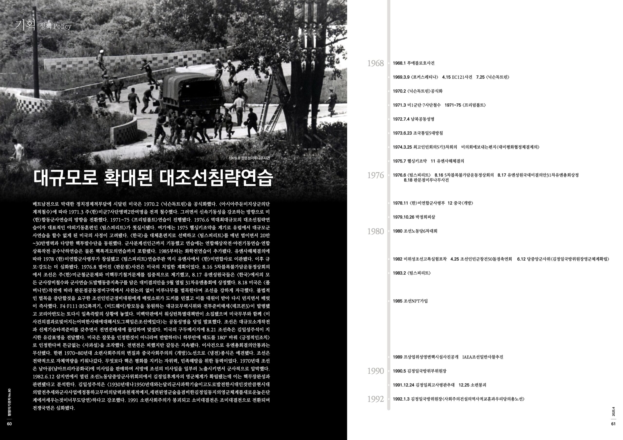 베트남전으로 막대한 정치경제적부담에 시달린 미국은 1970.2 <닉슨독트린>을 공식화했다. <아시아주둔미지상군의단계적철수>에 따라 1971.3 주<한>미군7사단병력2만여명을 전격 철수했다. 그러면서 신속기동성을 강조하는 방향으로 미<한>합동군사연습의 방향을 전환했다. 1971~75 <프리덤볼트>연습이 진행됐다. 1976.6 역대최대규모의 대조선침략연습이자 대표적인 야외기동훈련인 <팀스피리트>가 첫실시됐다. 여기에는 1975 헬싱키조약을 계기로 유럽에서 대규모군사연습을 할수 없게 된 미국의 사정이 고려됐다. <한국>을 대체훈련지로 선택하고 <팀스피리트>를 매년 벌이면서 20만~30만병력과 다양한 핵투발수단을 동원했다. 군사분계선인근까지 기동했고 연습에는 연합해상작전·야전기동연습·연합상륙작전·공수낙하연습은 물론 핵폭격모의연습까지 포함됐다. 1985부터는 화학전연습이 추가됐다. 유엔사해체결의에 따라 1978 <한>미연합군사령부가 창설됐고 <팀스피리트>연습주관 역시 유엔사에서 <한>미연합사로 이관됐다. 이후 규모·강도는 더 심화됐다. 1976.8 벌어진 <판문점>사건은 미국의 치밀한 계획이었다. 8.16 5차블록불가담운동정상회의에서 조선은 주<한>미군철군문제와 미핵무기철거문제를 집중적으로 제기했고, 8.17 유엔성원국들은 <한국>에서의 모든 군사장비철수와 군사연습·도발행동중지촉구를 담은 대미결의안을 9월 열릴 31차유엔총회에 상정했다. 8.18 미국은 <폴버니언>작전에 따라 판문점공동경비구역에서 사전논의 없이 미루나무를 벌목한다며 조선을 강하게 자극했다. 불법적인 벌목을 중단할것을 요구한 조선인민군경비대원에게 배럿소위가 도끼를 던졌고 이를 대원이 받아 다시 던지면서 배럿이 즉사했다. F4·F111·B52폭격기, <미드웨이>항모등을 동원하는 대규모무력시위와 전투준비태세<데프콘3>이 발령됐고 코리아반도는 또다시 일촉즉발의 상황에 놓였다. 미백악관에서 워싱턴특별대책반이 소집됐으며 미국무부와 함께 <이사건의결과로빚어지는어떠한사태에대해서도그책임은조선에있다>는 공동성명을 당일 발표했다. 조선은 대규모소개작전과 선제기습타격준비를 갖추면서 전면전태세에 돌입하며 맞섰다. 미국의 구두메시지에 8.21 조선측은 김일성주석이 지시한 유감표명을 전달했다. 미국은 잘못을 인정한것이 아니라며 반발하더니 하루만에 태도를 180° 바꿔 <긍정적인조치>로 인정한다며 뜬금없는 <사과설>을 조작했다. 전면전은 피했지만 갈등은 지속됐다. 이사건으로 유엔총회결의안통과는 무산됐다. 한편 1970~80년대 소련사회주의의 변질과 중국사회주의의 <개방>노선으로 <냉전>종식은 예견됐다. 조선은 전략적으로 자체역량을 키워나갔다. 무엇보다 핵은 평화를 지키는 자위력, 민족해방을 위한 동력이었다. 1970년대 조선은 남아공(남아프리카공화국)에 미사일을 판매하며 서방에 조선의 미사일을 일부러 노출시키면서 군사적으로 압박했다. 1982.6.12 삼지연에서 열린 조선노동당중앙군사위회의에서 김정일후계자의 영군체계가 확립됐는데 이는 핵무장완성과 관련됐다고 분석한다. 김일성주석은 <1930년대나1950년대와는달리군사과학기술이고도로발전한시대인것만큼현시대의발전추세와군사사업에정통하고무비의담력과천재적예지,세련된영군술을겸비한김정일동지의영군체계를새로운높은단계에서세우는것이너무도당연>하다고 강조했다. 1991 소련사회주의가 붕괴되고 소미대결전은 조미대결전으로 전환되며 전쟁국면은 심화됐다.