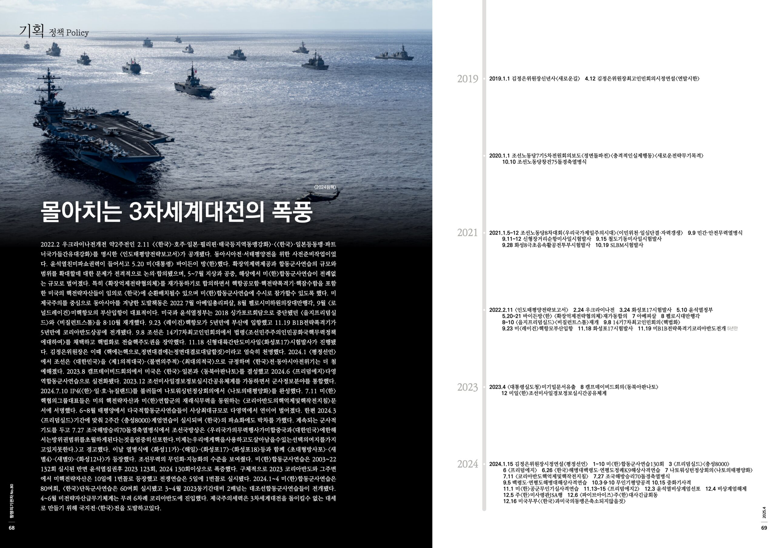 2022.2 우크라이나전개전 약2주전인 2.11 <<한국>·호주·일본·필리핀·태국등지역동맹강화>·<<한국>·일본등동맹·파트너국가들간유대강화>를 명시한 <인도태평양전략보고서>가 공개됐다. 동아시아전·서태평양전을 위한 사전준비작업이었다. 윤석열친미파쇼권력이 들어서고 5.20 미<대통령> 바이든이 방<한>했다. 확장억제력제공과 합동군사연습의 규모와 범위를 확대할데 대한 문제가 전격적으로 논의·합의됐으며, 5~7월 지상과 공중, 해상에서 미<한>합동군사연습이 전례없는 규모로 벌어졌다. 특히 <확장억제전략협의체>를 재가동하기로 합의하면서 핵항공모함·핵전략폭격기·핵잠수함을 포함한 미국의 핵전략자산들이 임의로 <한국>에 순환배치될수 있으며 미<한>합동군사연습에 수시로 참가할수 있도록 했다. 미제국주의를 중심으로 동아시아를 겨냥한 도발책동은 2022 7월 아베일총리피살, 8월 펠로시미하원의장대만행각, 9월 <로널드레이건>미핵항모의 부산입항이 대표적이다. 미국과 윤석열정부는 2018 싱가포르회담으로 중단됐던 <을지프리덤실드>와 <비질런트스톰>을 8·10월 재개했다. 9.23 <레이건>핵항모가 5년만에 부산에 입항했고 11.19 B1B전략폭격기가 5년만에 코리아반도상공에 전개됐다. 9.8 조선은 14기7차최고인민회의에서 법령<조선민주주의인민공화국핵무력정책에대하여>를 채택하고 핵법화로 전술핵주도권을 장악했다. 11.18 신형대륙간탄도미사일<화성포17>시험발사가 진행됐다. 김정은위원장은 이때 <핵에는핵으로,정면대결에는정면대결로대답할것>이라고 엄숙히 천명했다. 2024.1 <평정선언>에서 조선은 <대한민국>을 <제1의적대국>·<불변의주적>·<최대의적국>으로 규정하며 <한국>전·동아시아전위기는 더 첨예해졌다. 2023.8 캠프데이비드회의에서 미국은 <한국>·일본과 <동북아판나토>를 결성했고 2024.6 <프리덤에지>다영역합동군사연습으로 실전화됐다. 2023.12 조선미사일경보정보실시간공유체계를 가동하면서 군사정보분야를 통합했다. 2024.7.10 IP4(<한>·일·호·뉴질랜드)를 불러들여 나토워싱턴정상회의에서 <나토의태평양화>를 완성했다. 7.11 미<한>핵협의그룹대표들은 미의 핵전략자산과 미<한>연합군의 재래식무력을 동원하는 <코리아반도의핵억제및핵작전지침>문서에 서명했다. 6~8월 태평양에서 다국적합동군사연습들이 사상최대규모로 다영역에서 연이어 벌어졌다. 한편 2024.3 <프리덤실드>기간에 맞춰 2주간 <충성8000>계엄연습이 실시되며 <한국>의 파쇼화에도 박차를 가했다. 계속되는 군사적기도를 두고 7.27 조국해방승리70돌경축열병식에서 조선국방상은 <우리국가의무력행사가미합중국과<대한민국>에한해서는방위권범위를초월하게된다는것을엄중히선포한다.미제는우리에게핵을사용하고도살아남을수있는선택의여지를가지고있지못한다.>고 경고했다. 이날 열병식에 <화성11가>·<해일>·<화성포17>·<화성포18>등과 함께 <초대형방사포>·<새별4>·<새별9>·<화성12나>가 등장했다. 조선무력의 무인화·지능화의 수준을 보여줬다. 미<한>합동군사연습은 2003~22 132회 실시된 반면 윤석열집권후 2023 123회, 2024 130회이상으로 폭증했다. 구체적으로 2023 코리아반도와 그주변에서 미핵전략자산은 10일에 1번꼴로 등장했고 전쟁연습은 5일에 1번꼴로 실시됐다. 2024.1~4 미<한>합동군사연습은 80여회, <한국>단독군사연습은 60여회 실시됐고 3~4월 2023동기간대비 2배넘는 대조선합동군사연습들이 전개됐다. 4~6월 미전략자산급무기체계는 무려 6차례 코리아반도에 진입했다. 제국주의세력은 3차세계대전을 돌이킬수 없는 대세로 만들기 위해 국지전·<한국>전을 도발하고있다.