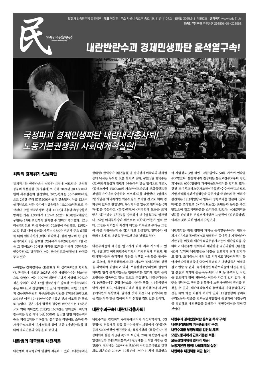 경제위기와 민생파탄이 심각한 지경에 이르렀다. 윤석열정부의 무분별한 <부자감세>로 인해 2024년 30조8000억원의 세수결손이 발생했다. 2023년에는 56조4000억원으로 2년간 무려 87조2000억원이 결손됐다. 이중 12.3비상계엄으로 인한 추가세수결손액은 1조2000억원으로 추산된다. 2월 한국은행은 올해 GDP(국내총생산)성장률전망치를 기존 1.9%에서 1.5%로 낮췄고 KDI(한국개발연구원)는 1%대 초반까지 떨어질 수 있다고 경고했다. 12.3비상계엄선포 후 증시에서만 79조원이 증발했고, 12월2~27일 원화 대비 달러화 가치는 4.8%나 뛰면서 주요 6개통화 대비 원화가치가 3배나 하락했다. 한편 영국의 한 경제분석기관이 2월 발표한 <민주주의지수2024>에서 <한국>은 그 전해보다 10계단 하락한 32위를 기록해 <결함있는 민주주의>로 강등됐다. 이는 국가신뢰도·안정성에 타격을 주고 있다.
