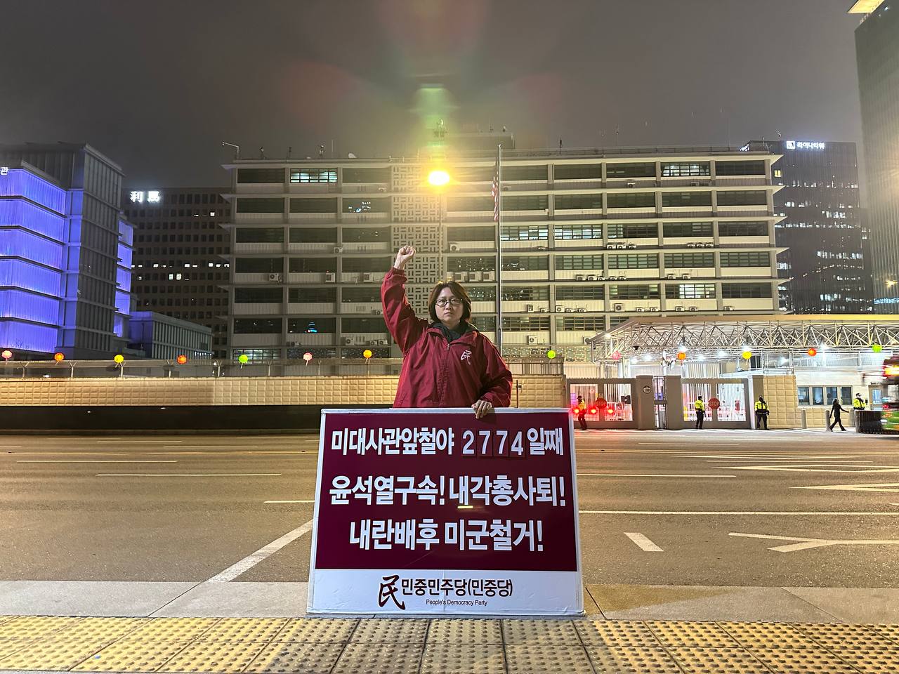 1일 민중민주당(민중당)은 미대사관앞에서 <윤석열구속! 내각총사퇴! 내란배후 미군철거!> 구호를 들고 평화시위를 3207일째 전개했다.