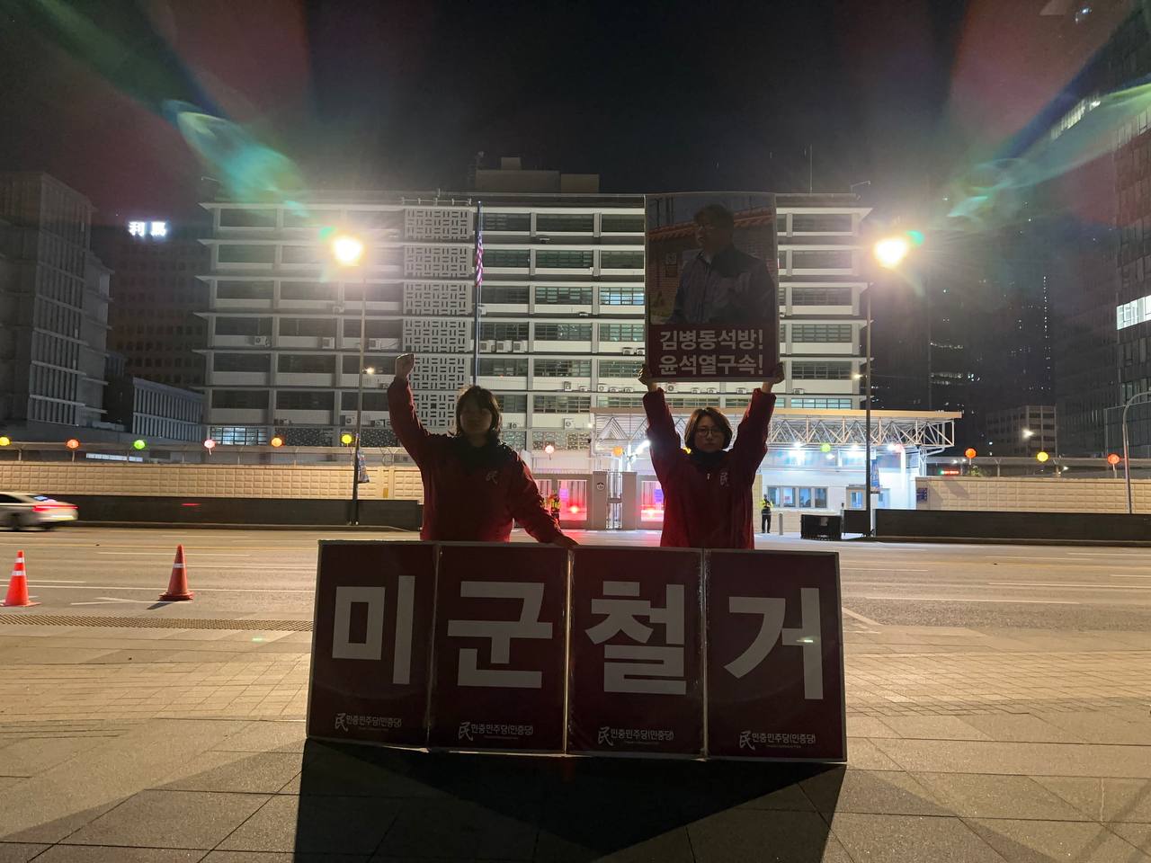 미대사관정문 맞은편에서는 우리말과 영어로 된 구호 <윤석열구속! 내각총사퇴! 내란배후 미군철거!>를 들고 <광화문미대사관앞철야시위>를 진행했다. <김병동석방! 윤석열구속!> 구호도 함께 들었다.