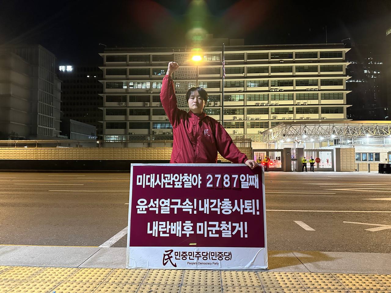 15일 민중민주당(민중당)은 미대사관앞에서 <윤석열구속! 내각총사퇴! 내란배후 미군철거!> 구호를 들고 평화시위를 3221일째 전개했다.