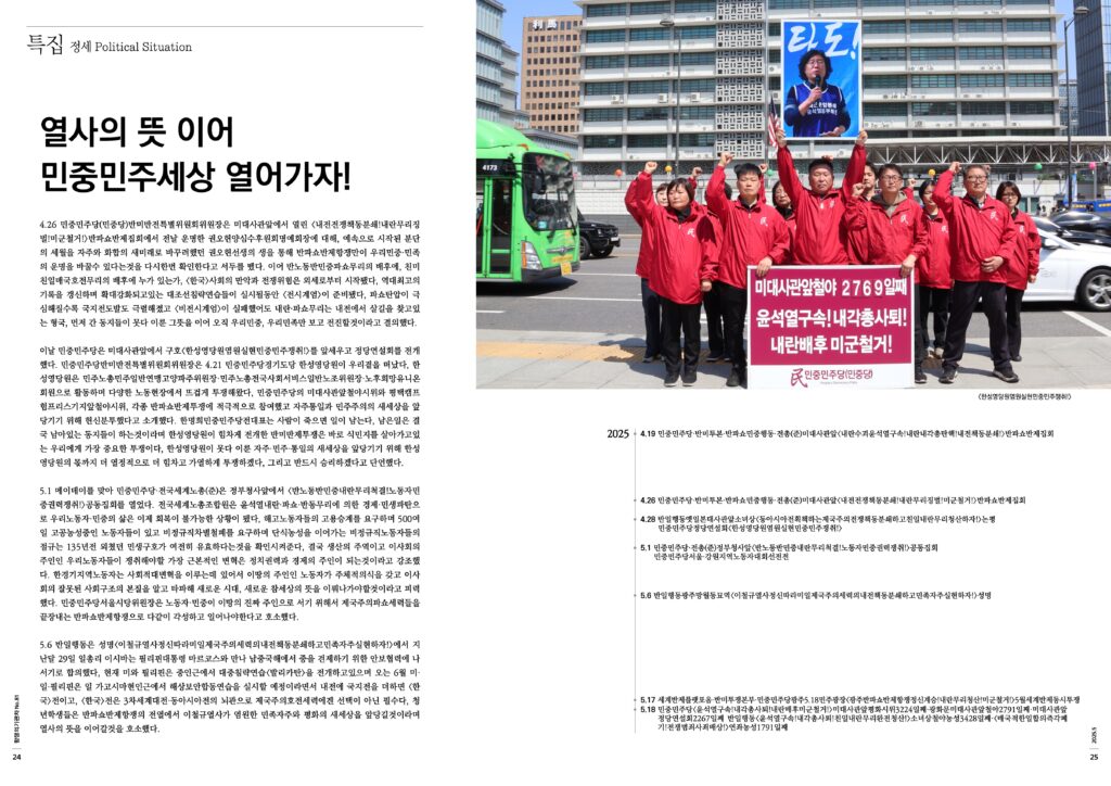 5.1 메이데이를 맞아 민중민주당·전국세계노총(준)은 정부청사앞에서 <반노동반민중내란무리척결!노동자민중권력쟁취!>공동집회를 열었다. 전국세계노총조합원은 윤석열내란·파쇼·반동무리에 의한 경제·민생파탄으로 우리노동자·민중의 삶은 이제 회복이 불가능한 상황이 됐다, 해고노동자들의 고용승계를 요구하며 500여일 고공농성중인 노동자들이 있고 비정규직차별철폐를 요구하며 단식농성을 이어가는 비정규직노동자들의 절규는 135년전 외쳤던 민생구호가 여전히 유효하다는것을 확인시켜준다, 결국 생산의 주역이고 이사회의 주인인 우리노동자들이 쟁취해야할 가장 근본적인 변혁은 정치권력과 경제의 주인이 되는것이라고 강조했다. 한경기지역노동자는 사회적대변혁을 이루는데 있어서 이땅의 주인인 노동자가 주체적의식을 갖고 이사회의 잘못된 사회구조의 본질을 알고 타파해 새로운 시대, 새로운 참세상의 뜻을 이뤄나가야할것이라고 피력했다. 민중민주당서울시당위원장은 노동자·민중이 이땅의 진짜 주인으로 서기 위해서 제국주의파쇼세력들을 끝장내는 반파쇼반제항쟁으로 다같이 각성하고 일어나야한다고 호소했다.