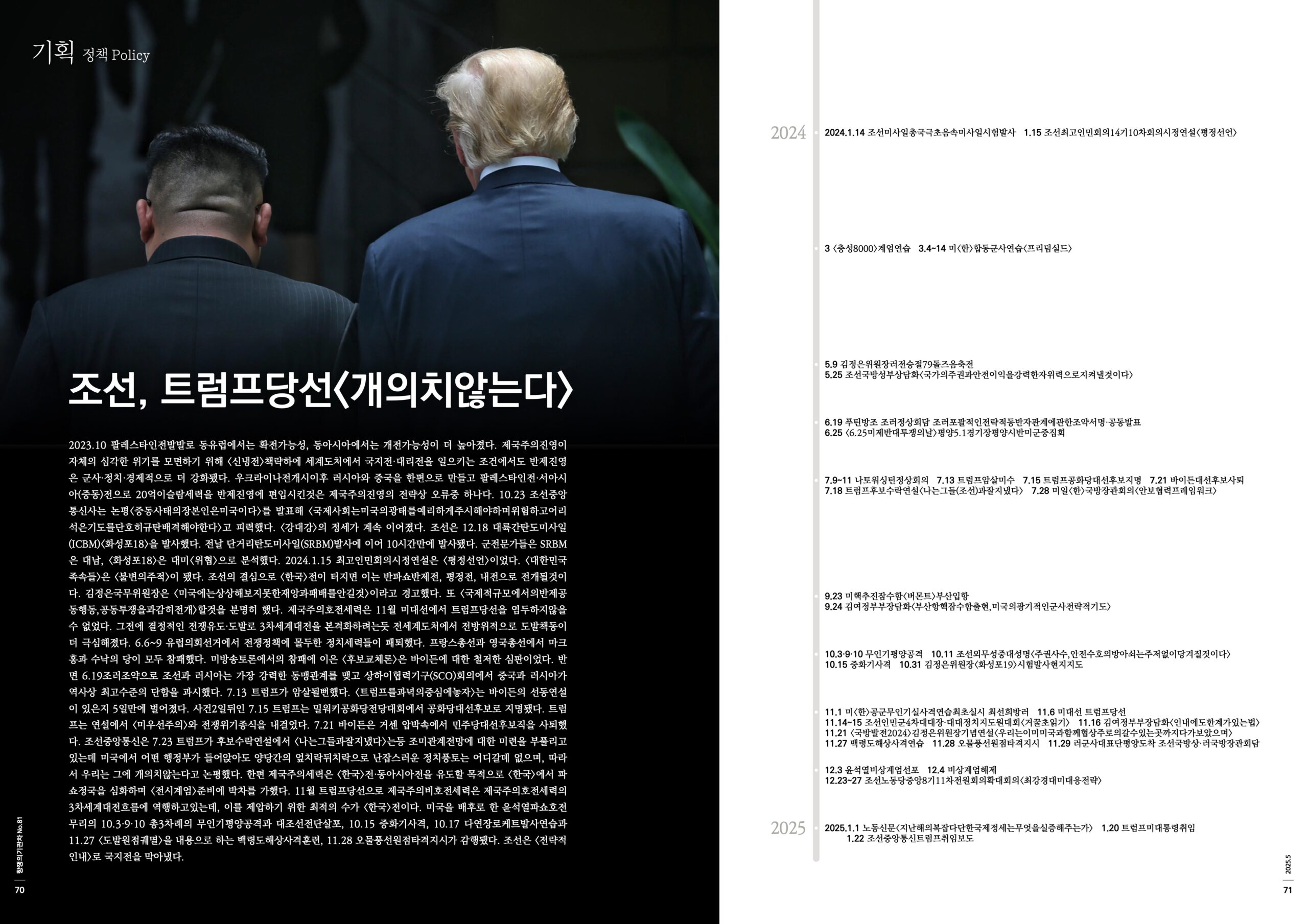 2023.10 팔레스타인전발발로 동유럽에서는 확전가능성, 동아시아에서는 개전가능성이 더 높아졌다. 제국주의진영이 자체의 심각한 위기를 모면하기 위해 <신냉전>책략하에 세계도처에서 국지전·대리전을 일으키는 조건에서도 반제진영은 군사·정치·경제적으로 더 강화됐다. 우크라이나전개시이후 러시아와 중국을 한편으로 만들고 팔레스타인전·서아시아(중동)전으로 20억이슬람세력을 반제진영에 편입시킨것은 제국주의진영의 전략상 오류중 하나다. 10.23 조선중앙통신사는 논평<중동사태의장본인은미국이다>를 발표해 <국제사회는미국의광태를예리하게주시해야하며위험하고어리석은기도를단호히규탄배격해야한다>고 피력했다. <강대강>의 정세가 계속 이어졌다. 조선은 12.18 대륙간탄도미사일(ICBM)<화성포18>을 발사했다. 전날 단거리탄도미사일(SRBM)발사에 이어 10시간만에 발사됐다. 군전문가들은 SRBM은 대남, <화성포18>은 대미<위협>으로 분석했다. 2024.1.15 최고인민회의시정연설은 <평정선언>이었다. <대한민국족속들>은 <불변의주적>이 됐다. 조선의 결심으로 <한국>전이 터지면 이는 반파쇼반제전, 평정전, 내전으로 전개될것이다. 김정은국무위원장은 <미국에는상상해보지못한재앙과패배를안길것>이라고 경고했다. 또 <국제적규모에서의반제공동행동,공동투쟁을과감히전개>할것을 분명히 했다. 제국주의호전세력은 11월 미대선에서 트럼프당선을 염두하지않을수 없었다. 그전에 결정적인 전쟁유도·도발로 3차세계대전을 본격화하려는듯 전세계도처에서 전방위적으로 도발책동이 더 극심해졌다. 6.6~9 유럽의회선거에서 전쟁정책에 몰두한 정치세력들이 패퇴했다. 프랑스총선과 영국총선에서 마크홍과 수낙의 당이 모두 참패했다. 미방송토론에서의 참패에 이은 <후보교체론>은 바이든에 대한 철저한 심판이었다. 반면 6.19조러조약으로 조선과 러시아는 가장 강력한 동맹관계를 맺고 상하이협력기구(SCO)회의에서 중국과 러시아가 역사상 최고수준의 단합을 과시했다. 7.13 트럼프가 암살될뻔했다. <트럼프를과녁의중심에놓자>는 바이든의 선동연설이 있은지 5일만에 벌어졌다. 사건2일뒤인 7.15 트럼프는 밀워키공화당전당대회에서 공화당대선후보로 지명됐다. 트럼프는 연설에서 <미우선주의>와 전쟁위기종식을 내걸었다. 7.21 바이든은 거센 압박속에서 민주당대선후보직을 사퇴했다. 조선중앙통신은 7.23 트럼프가 후보수락연설에서 <나는그들과잘지냈다>는등 조미관계전망에 대한 미련을 부풀리고있는데 미국에서 어떤 행정부가 들어앉아도 양당간의 엎치락뒤치락으로 난잡스러운 정치풍토는 어디갈데 없으며, 따라서 우리는 그에 개의치않는다고 논평했다. 한편 제국주의세력은 <한국>전·동아시아전을 유도할 목적으로 <한국>에서 파쇼정국을 심화하며 <전시계엄>준비에 박차를 가했다. 11월 트럼프당선으로 제국주의비호전세력은 제국주의호전세력의 3차세계대전흐름에 역행하고있는데, 이를 제압하기 위한 최적의 수가 <한국>전이다. 미국을 배후로 한 윤석열파쇼호전무리의 10.3·9·10 총3차례의 무인기평양공격과 대조선전단살포, 10.15 중화기사격, 10.17 다연장로케트발사연습과 11.27 <도발원점궤멸>을 내용으로 하는 백령도해상사격훈련, 11.28 오물풍선원점타격지시가 감행됐다. 조선은 <전략적인내>로 국지전을 막아냈다.