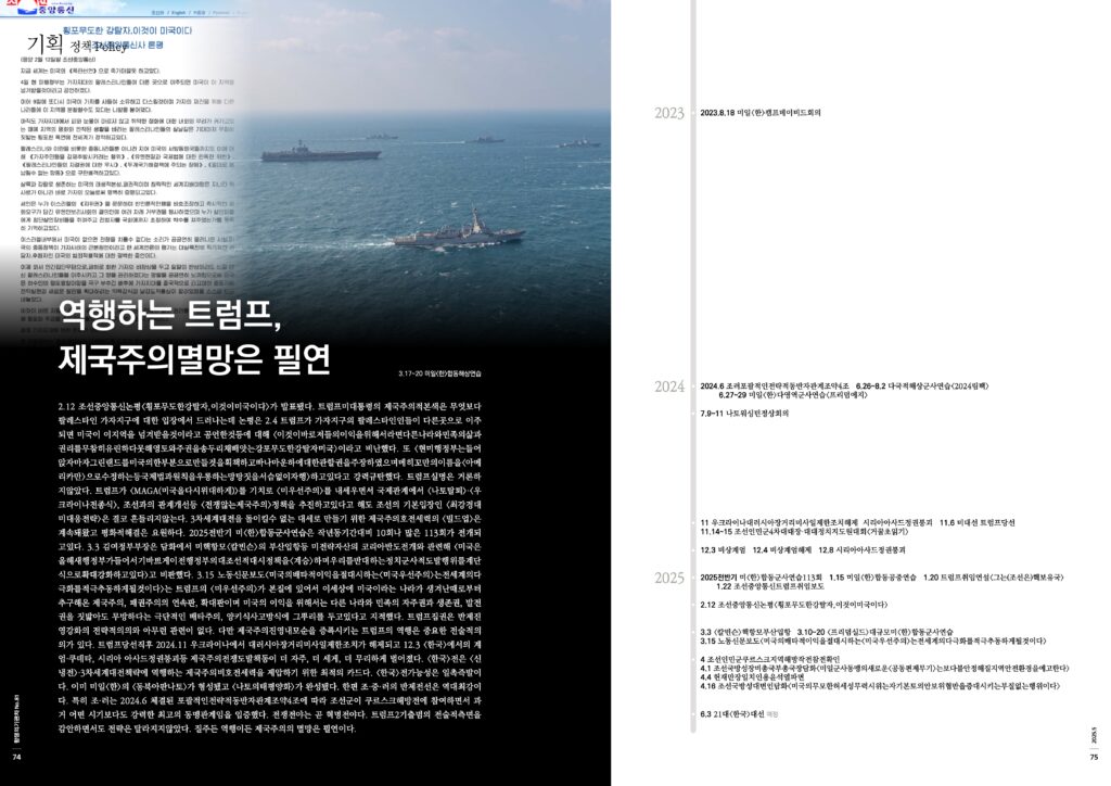 2.12 조선중앙통신논평<횡포무도한강탈자,이것이미국이다>가 발표됐다. 트럼프미대통령의 제국주의적본색은 무엇보다 팔레스타인 가자지구에 대한 입장에서 드러나는데 논평은 2.4 트럼프가 가자지구의 팔레스타인인들이 다른곳으로 이주되면 미국이 이지역을 넘겨받을것이라고 공언한것등에 대해 <이것이바로저들의이익을위해서라면다른나라와민족의삶과권리를무참히유린하다못해영토와주권을송두리채빼앗는강포무도한강탈자미국>이라고 비난했다. 또 <현미행정부는들어앉자마자그린랜드를미국의한부분으로만들것을획책하고빠나마운하에대한관할권을주장하였으며메히꼬만의이름을<아메리카만>으로수정하는등국제법과원칙을우롱하는망탕짓을서슴없이자행>하고있다고 강력규탄했다. 트럼프실명은 거론하지않았다. 트럼프가 <MAGA(미국을다시위대하게)>를 기치로 <미우선주의>를 내세우면서 국제관계에서 <나토탈퇴>·<우크라이나전종식>, 조선과의 관계개선등 <전쟁않는제국주의>정책을 추진하고있다고 해도 조선의 기본입장인 <최강경대미대응전략>은 결코 흔들리지않는다. 3차세계대전을 돌이킬수 없는 대세로 만들기 위한 제국주의호전세력의 <빌드업>은 계속돼왔고 평화적해결은 요원하다. 2025전반기 미<한>합동군사연습은 작년동기간대비 10회나 많은 113회가 전개되고있다. 3.3 김여정부부장은 담화에서 미핵항모<칼빈슨>의 부산입항등 미전략자산의 코리아반도전개와 관련해 <미국은올해새행정부가들어서기바쁘게이전행정부의대조선적대시정책을<계승>하며우리를반대하는정치군사적도발행위를계단식으로확대강화하고있다>고 비판했다. 3.15 노동신문보도<미국의배타적이익을절대시하는<미국우선주의>는전세계의다극화를적극추동하게될것이다>는 트럼프의 <미우선주의>가 본질에 있어서 이세상에 미국이라는 나라가 생겨난때로부터 추구해온 제국주의, 패권주의의 연속판, 확대판이며 미국의 이익을 위해서는 다른 나라와 민족의 자주권과 생존권, 발전권을 짓밟아도 무방하다는 극단적인 배타주의, 양키식사고방식에 그뿌리를 두고있다고 지적했다. 트럼프집권은 반제진영강화의 전략적의의와 아무런 관련이 없다. 다만 제국주의진영내모순을 증폭시키는 트럼프의 역행은 중요한 전술적의의가 있다. 트럼프당선직후 2024.11 우크라이나에서 대러시아장거리미사일제한조치가 해제되고 12.3 <한국>에서의 계엄·쿠데타, 시리아 아사드정권붕괴등 제국주의전쟁도발책동이 더 자주, 더 세게, 더 무리하게 벌어졌다. <한국>전은 <신냉전>·3차세계대전책략에 역행하는 제국주의비호전세력을 제압하기 위한 최적의 카드다. <한국>전가능성은 일촉즉발이다. 이미 미일<한>의 <동북아판나토>가 형성됐고 <나토의태평양화>가 완성됐다. 한편 조·중·러의 반제전선은 역대최강이다. 특히 조·러는 2024.6 체결된 포괄적인전략적동반자관계조약4조에 따라 조선군이 쿠르스크해방전에 참여하면서 과거 어떤 시기보다도 강력한 최고의 동맹관계임을 입증했다. 전쟁전야는 곧 혁명전야다. 트럼프2기출범의 전술적측면을 감안하면서도 전략은 달라지지않았다. 질주든 역행이든 제국주의의 멸망은 필연이다.