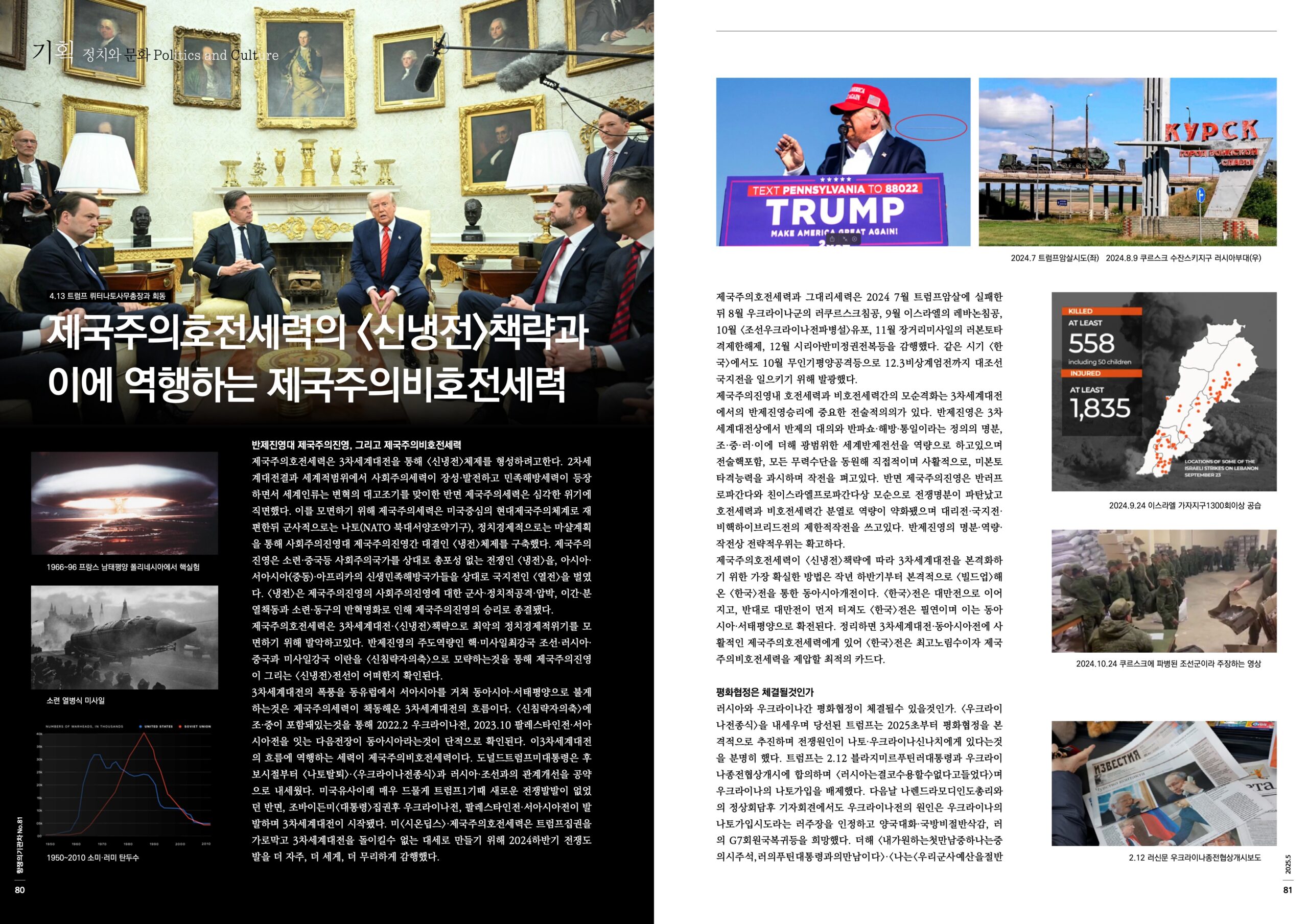 제국주의호전세력과 그대리세력은 2024 7월 트럼프암살에 실패한뒤 8월 우크라이나군의 러쿠르스크침공, 9월 이스라엘의 레바논침공, 10월 <조선우크라이나전파병설>유포, 11월 장거리미사일의 러본토타격제한해제, 12월 시리아반미정권전복등을 감행했다. 같은 시기 <한국>에서도 10월 무인기평양공격등으로 12.3비상계엄전까지 대조선국지전을 일으키기 위해 발광했다.