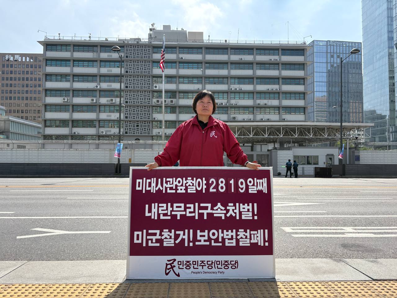 15일 민중민주당(민중당)은 미대사관앞에서 <내전책동 내란무리처벌! 전쟁책동 미군철거!> 구호를 들고 평화시위를 3252일째 전개했다.