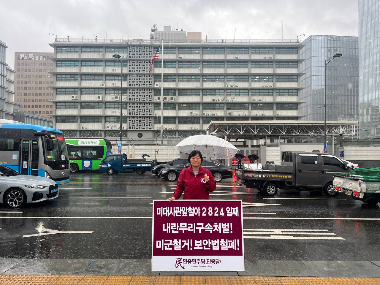 20일 민중민주당(민중당)은 미대사관앞에서 <내전책동 내란무리처벌! 전쟁책동 미군철거!> 구호를 들고 평화시위를 3257일째 전개했다.