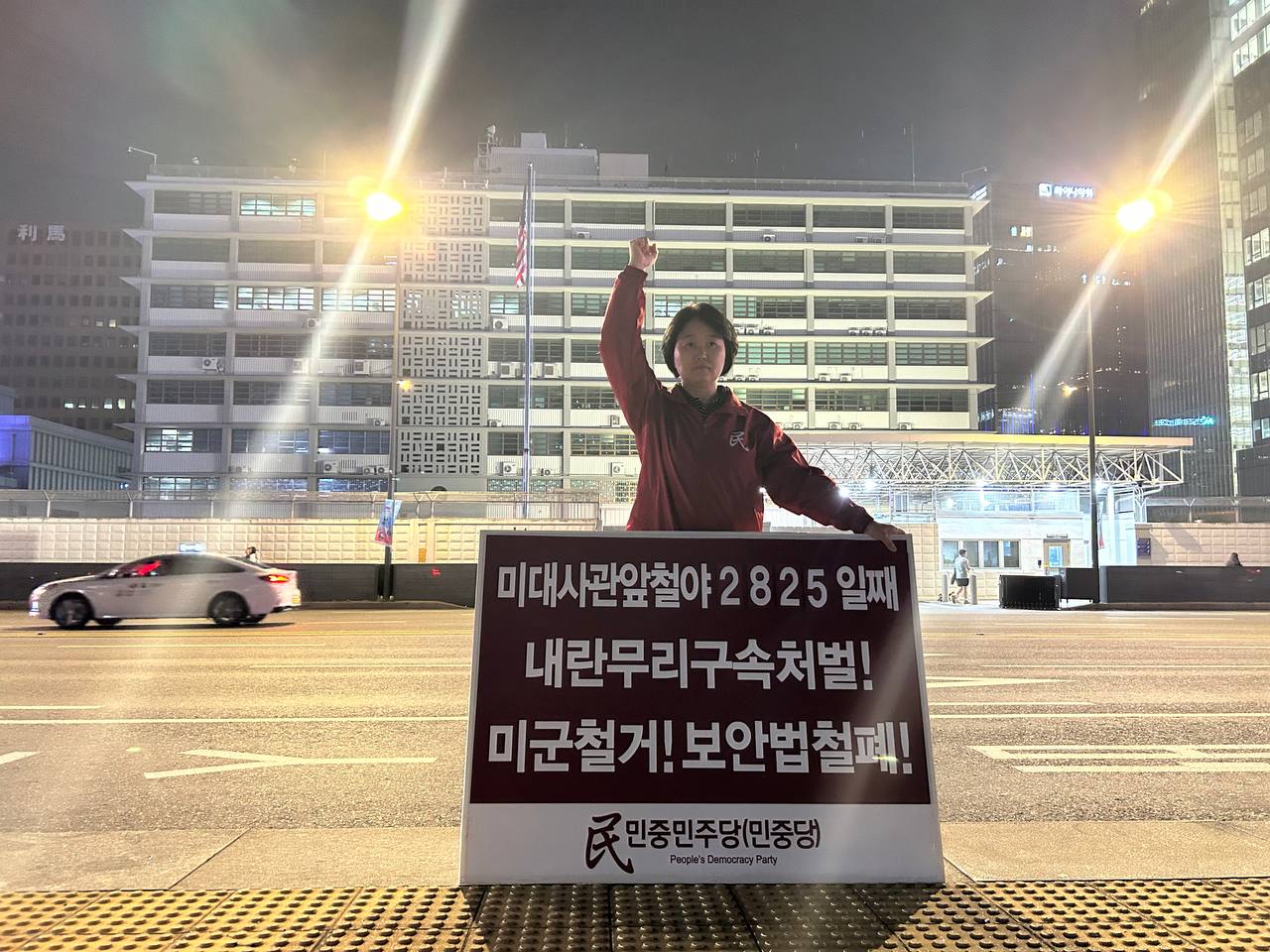미대사관정문 맞은편에서는 우리말과 영어로 된 구호 <내란무리구속처벌! 미군철거! 보안법철폐!>를 들고 <광화문미대사관앞철야시위>를 진행했다. <김병동석방! 윤석열구속!> 구호도 함께 들었다.