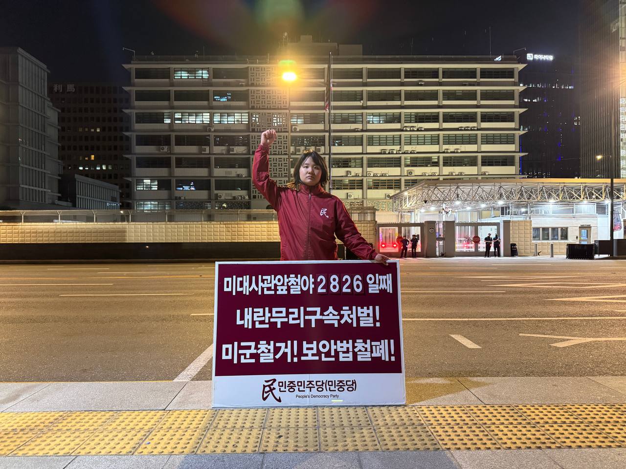 미대사관정문 맞은편에서는 우리말과 영어로 된 구호 <내란무리구속처벌! 미군철거! 보안법철폐!>를 들고 <광화문미대사관앞철야시위>를 진행했다. <김병동석방! 윤석열구속!> 구호도 함께 들었다.