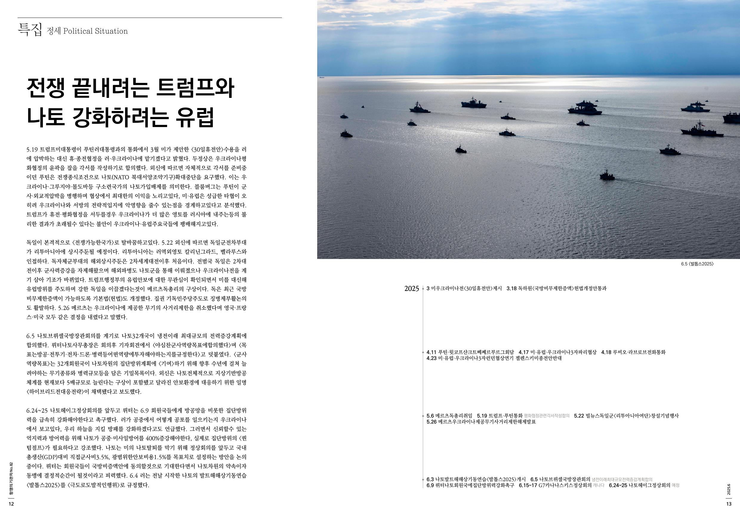 5.19 트럼프미대통령이 푸틴러대통령과의 통화에서 3월 미가 제안한 <30일휴전안>수용을 러에 압박하는 대신 휴·종전협정을 러·우크라이나에 맡기겠다고 밝혔다. 두정상은 우크라이나평화협정의 윤곽을 잡을 각서를 작성하기로 합의했다. 외신에 따르면 자체적으로 각서를 준비중이던 푸틴은 전쟁종식조건으로 나토(NATO 북대서양조약기구)확대중단을 요구했다. 이는 우크라이나·그루지야·몰도바등 구소련국가의 나토가입배제를 의미한다. 블룸버그는 푸틴이 군사·외교적압박을 병행하며 협상에서 최대한의 이익을 노리고있다, 미·유럽은 성급한 타협이 오히려 우크라이나와 서방의 전략적입지에 악영향을 줄수 있는점을 경계하고있다고 분석했다. 트럼프가 휴전·평화협정을 서두를경우 우크라이나가 더 많은 영토를 러시아에 내주는등의 불리한 결과가 초래될수 있다는 불안이 우크라이나·유럽주요국들에 팽배해지고있다.