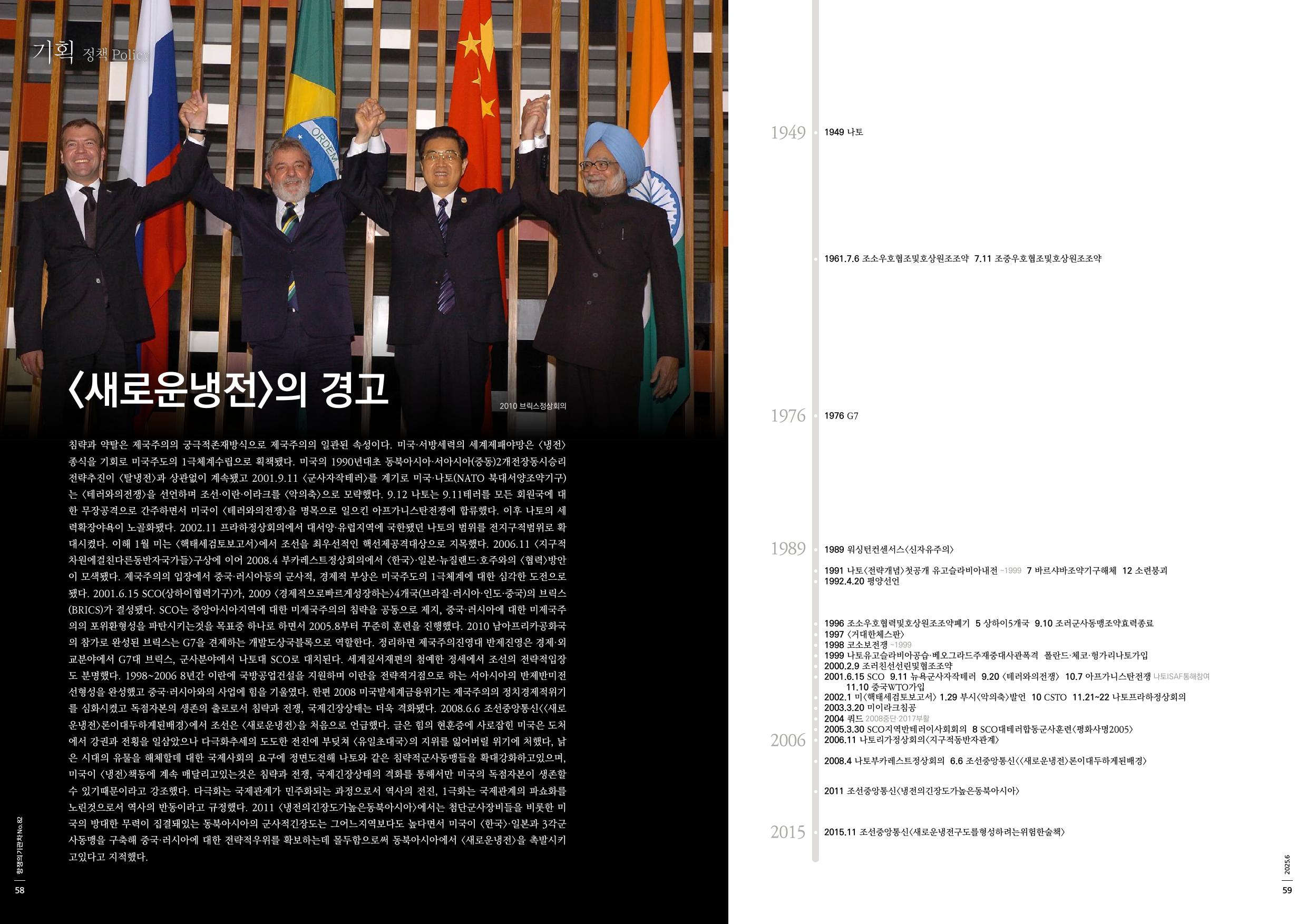 침략과 약탈은 제국주의의 궁극적존재방식으로 제국주의의 일관된 속성이다. 미국·서방세력의 세계제패야망은 <냉전>종식을 기회로 미국주도의 1극체계수립으로 획책됐다. 미국의 1990년대초 동북아시아·서아시아(중동)2개전장동시승리전략추진이 <탈냉전>과 상관없이 계속됐고 2001.9.11 <군사자작테러>를 계기로 미국·나토(NATO 북대서양조약기구)는 <테러와의전쟁>을 선언하며 조선·이란·이라크를 <악의축>으로 모략했다. 9.12 나토는 9.11테러를 모든 회원국에 대한 무장공격으로 간주하면서 미국이 <테러와의전쟁>을 명목으로 일으킨 아프가니스탄전쟁에 합류했다. 이후 나토의 세력확장야욕이 노골화됐다. 2002.11 프라하정상회의에서 대서양·유럽지역에 국한됐던 나토의 범위를 전지구적범위로 확대시켰다. 이해 1월 미는 <핵태세검토보고서>에서 조선을 최우선적인 핵선제공격대상으로 지목했다. 2006.11 <지구적차원에걸친다른동반자국가들>구상에 이어 2008.4 부카레스트정상회의에서 <한국>·일본·뉴질랜드·호주와의 <협력>방안이 모색됐다. 제국주의의 입장에서 중국·러시아등의 군사적, 경제적 부상은 미국주도의 1극체계에 대한 심각한 도전으로 됐다. 2001.6.15 SCO(상하이협력기구)가, 2009 <경제적으로빠르게성장하는>4개국(브라질·러시아·인도·중국)의 브릭스(BRICS)가 결성됐다. SCO는 중앙아시아지역에 대한 미제국주의의 침략을 공동으로 제지, 중국·러시아에 대한 미제국주의의 포위환형성을 파탄시키는것을 목표중 하나로 하면서 2005.8부터 꾸준히 훈련을 진행했다. 2010 남아프리카공화국의 참가로 완성된 브릭스는 G7을 견제하는 개발도상국블록으로 역할한다. 정리하면 제국주의진영대 반제진영은 경제·외교분야에서 G7대 브릭스, 군사분야에서 나토대 SCO로 대치된다. 세계질서재편의 첨예한 정세에서 조선의 전략적입장도 분명했다. 1998~2006 8년간 이란에 국방공업건설을 지원하며 이란을 전략적거점으로 하는 서아시아의 반제반미전선형성을 완성했고 중국·러시아와의 사업에 힘을 기울였다. 한편 2008 미국발세계금융위기는 제국주의의 정치경제적위기를 심화시켰고 독점자본의 생존의 출로로서 침략과 전쟁, 국제긴장상태는 더욱 격화됐다. 2008.6.6 조선중앙통신<<새로운냉전>론이대두하게된배경>에서 조선은 <새로운냉전>을 처음으로 언급했다. 글은 힘의 현훈증에 사로잡힌 미국은 도처에서 강권과 전횡을 일삼았으나 다극화추세의 도도한 전진에 부딪쳐 <유일초대국>의 지위를 잃어버릴 위기에 처했다, 낡은 시대의 유물을 해체할데 대한 국제사회의 요구에 정면도전해 나토와 같은 침략적군사동맹들을 확대강화하고있으며, 미국이 <냉전>책동에 계속 매달리고있는것은 침략과 전쟁, 국제긴장상태의 격화를 통해서만 미국의 독점자본이 생존할수 있기때문이라고 강조했다. 다극화는 국제관계가 민주화되는 과정으로서 역사의 전진, 1극화는 국제관계의 파쇼화를 노린것으로서 역사의 반동이라고 규정했다. 2011 <냉전의긴장도가높은동북아시아>에서는 첨단군사장비들을 비롯한 미국의 방대한 무력이 집결돼있는 동북아시아의 군사적긴장도는 그어느지역보다도 높다면서 미국이 <한국>·일본과 3각군사동맹을 구축해 중국·러시아에 대한 전략적우위를 확보하는데 몰두함으로써 동북아시아에서 <새로운냉전>을 촉발시키고있다고 지적했다.
