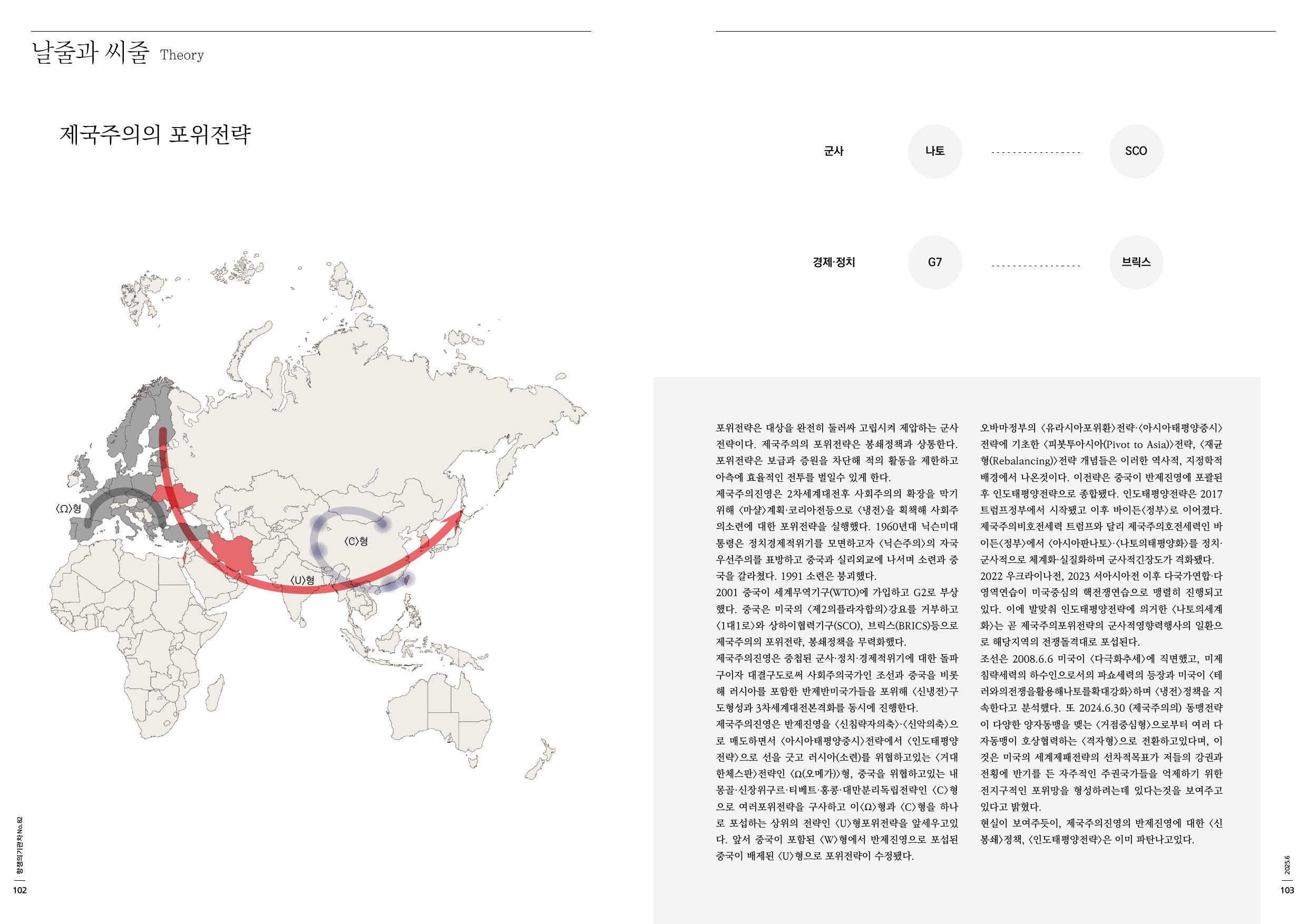 제국주의진영은 반제진영을 <신침략자의축>·<신악의축>으 로 매도하면서 <아시아태평양중시>전략에서 <인도태평양전략>으로 선을 긋고 러시아(소련)를 위협하고있는 <거대 한체스판>전략인 <Ω(오메가)>형, 중국을 위협하고있는 내몽골·신장위구르·티베트·홍콩·대만분리독립전략인 <C>형으로 여러포위전략을 구사하고 이<Ω>형과 <C>형을 하나로 포섭하는 상위의 전략인 <U>형포위전략을 앞세우고있다. 앞서 중국이 포함된 <W>형에서 반제진영으로 포섭된 중국이 배제된 <U>형으로 포위전략이 수정됐다.