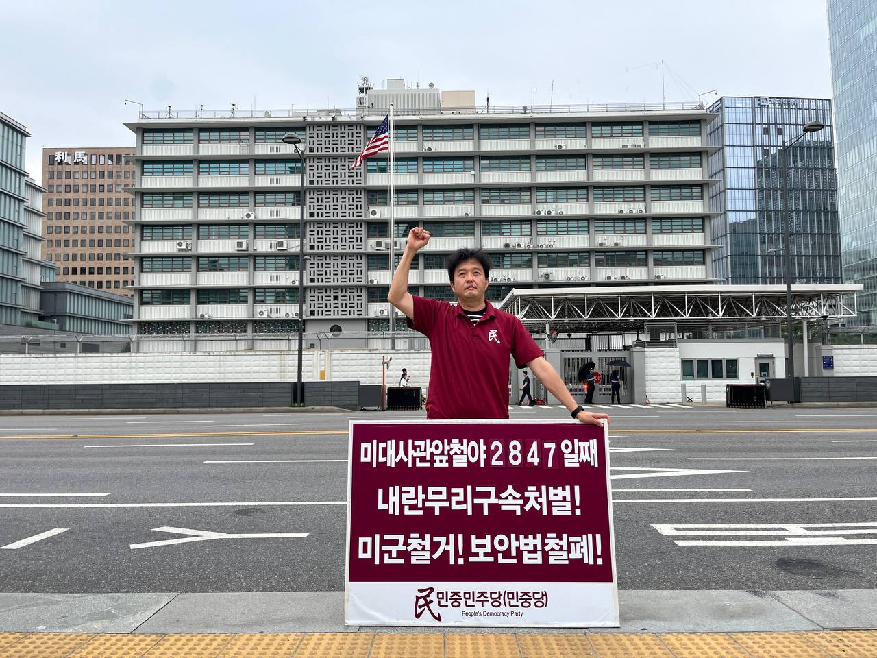 13일 민중민주당(민중당)은 미대사관앞에서 <내전책동 내란무리처벌! 전쟁책동 미군철거!> 구호를 들고 평화시위를 3280일째 전개했다.