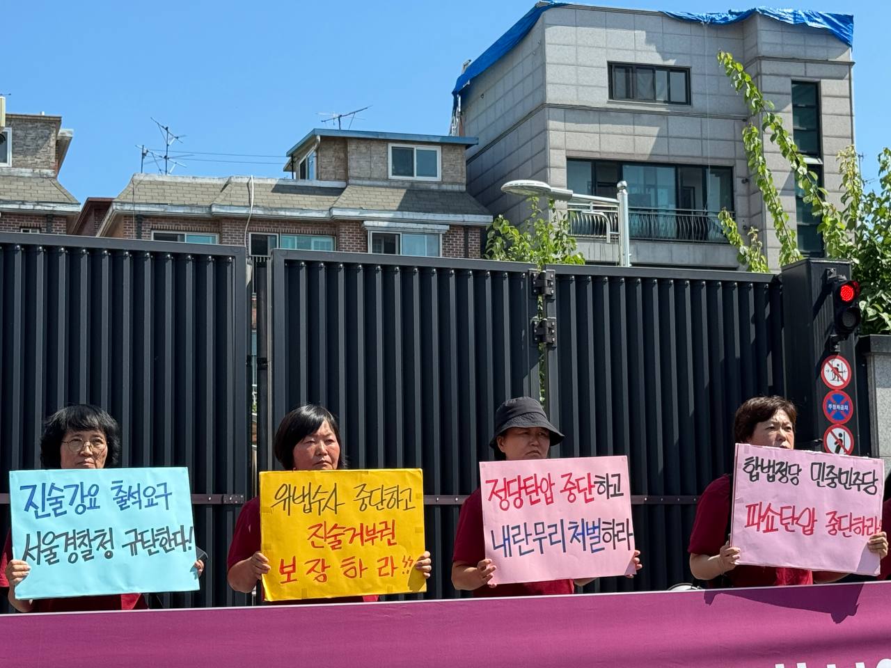 당원들은 <진술강요 출석요구 서울경찰청 규탄한다!>, <출석요구 체포협박 진술거부권침해 규탄한다!>, <합헌정당 파쇼탄압 안보수사과 해체하라!>, <사건조작 정당탄압 안보수사과 해체하라!>, <민중민주당탄압 중단하고 내란무리 처벌하라!>, <반민주파쇼악법 국가보안법 철폐하라!>, <내란무리 옹호하는 국가보안법 철폐하라!>, <진보세력 탄압하는 국가보안법 철폐하라!> 등 구호를 힘차게 외쳤다.