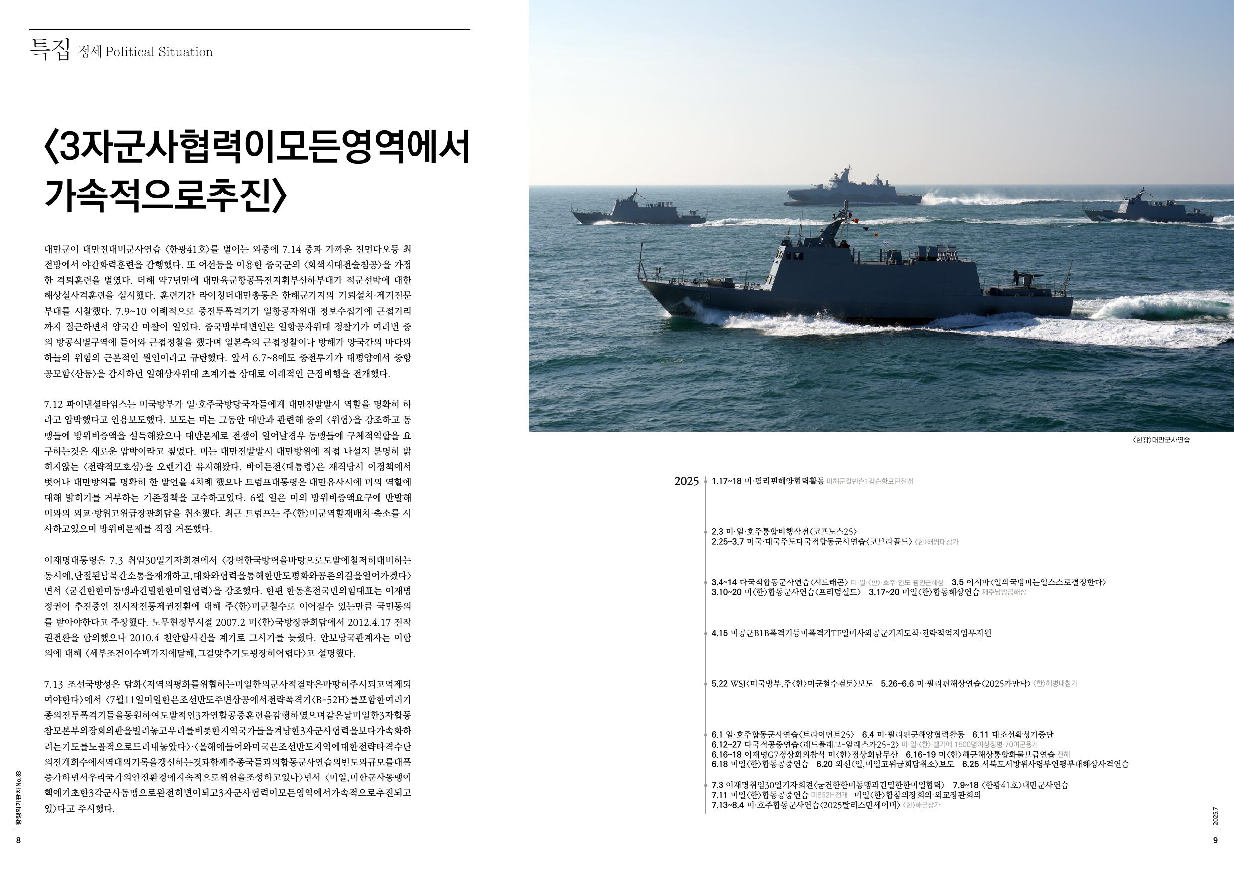 이재명대통령은 7.3 취임30일기자회견에서 <강력한국방력을바탕으로도발에철저히대비하는동시에,단절된남북간소통을재개하고,대화와협력을통해한반도평화와공존의길을열어가겠다>면서 <굳건한한미동맹과긴밀한한미일협력>을 강조했다. 한편 한동훈전국민의힘대표는 이재명정권이 추진중인 전시작전통제권전환에 대해 주<한>미군철수로 이어질수 있는만큼 국민동의를 받아야한다고 주장했다. 노무현정부시절 2007.2 미<한>국방장관회담에서 2012.4.17 전작권전환을 합의했으나 2010.4 천안함사건을 계기로 그시기를 늦췄다. 안보당국관계자는 이합의에 대해 <세부조건이수백가지에달해,그걸맞추기도굉장히어렵다>고 설명했다.