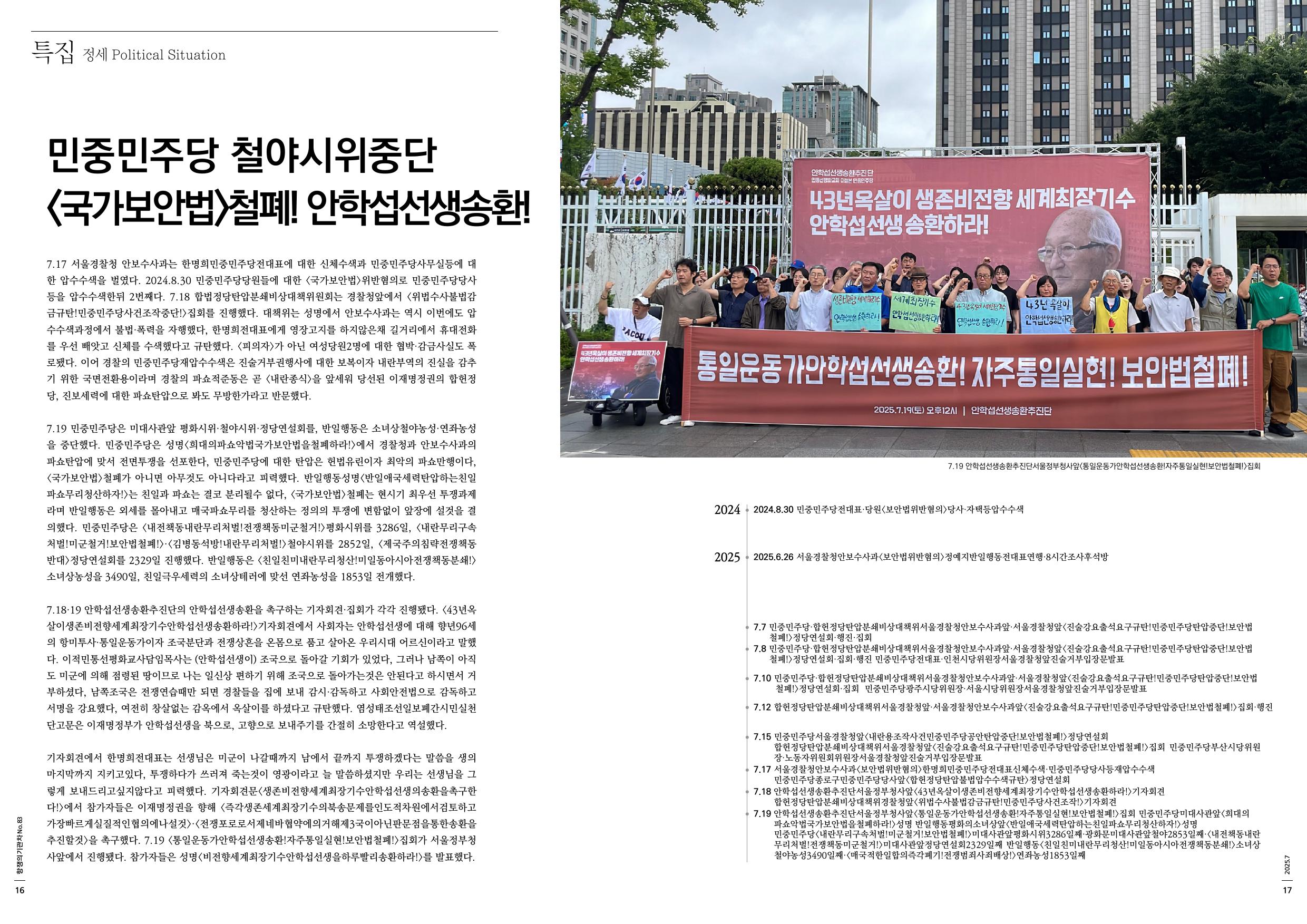 7.19 민중민주당은 미대사관앞 평화시위·철야시위·정당연설회를, 반일행동은 소녀상철야농성·연좌농성을 중단했다. 민중민주당은 성명<희대의파쇼악법국가보안법을철폐하라!>에서 경찰청과 안보수사과의 파쇼탄압에 맞서 전면투쟁을 선포한다, 민중민주당에 대한 탄압은 헌법유린이자 최악의 파쇼만행이다, <국가보안법>철폐가 아니면 아무것도 아니다라고 피력했다. 반일행동성명<반일애국세력탄압하는친일파쇼무리청산하자!>는 친일과 파쇼는 결코 분리될수 없다, <국가보안법>철폐는 현시기 최우선 투쟁과제라며 반일행동은 외세를 몰아내고 매국파쇼무리를 청산하는 정의의 투쟁에 변함없이 앞장에 설것을 결의했다. 민중민주당은 <내전책동내란무리처벌!전쟁책동미군철거!>평화시위를 3286일, <내란무리구속처벌!미군철거!보안법철폐!>·<김병동석방!내란무리처벌!>철야시위를 2852일, <제국주의침략전쟁책동반대>정당연설회를 2329일 진행했다. 반일행동은 <친일친미내란무리청산!미일동아시아전쟁책동분쇄!>소녀상농성을 3490일, 친일극우세력의 소녀상테러에 맞선 연좌농성을 1853일 전개했다.