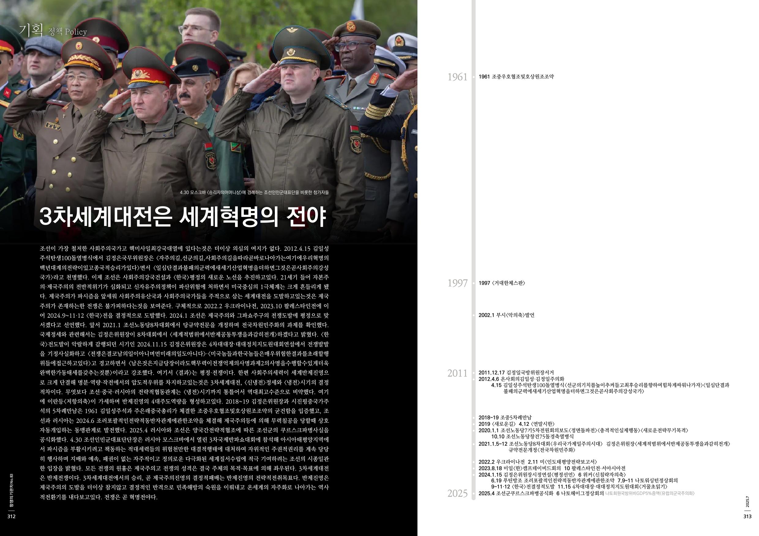 조선이 가장 철저한 사회주의국가고 핵미사일최강국대열에 있다는것은 더이상 의심의 여지가 없다. 2012.4.15 김일성주석탄생100돌열병식에서 김정은국무위원장은 <자주의길,선군의길,사회주의길을따라곧바로나아가는여기에우리혁명의백년대계의전략이있고종국적승리가있다>면서 <일심단결과불패의군력에새세기산업혁명을더하면그것은곧사회주의강성국가>라고 천명했다. 이제 조선은 사회주의강국건설과 <한국>평정의 새로운 노선을 추진하고있다. 21세기 들어 자본주의·제국주의의 전반적위기가 심화되고 신자유주의정책이 파산위험에 처하면서 미국중심의 1극체계는 크게 흔들리게 됐다. 제국주의가 파시즘을 앞세워 사회주의유산국과 사회주의국가들을 주적으로 삼는 세계대전을 도발하고있는것은 제국주의가 존재하는한 전쟁은 불가피하다는것을 보여준다. 구체적으로 2022.2 우크라이나전, 2023.10 팔레스타인전에 이어 2024.9~11·12 <한국>전을 결정적으로 도발했다. 2024.1 조선은 제국주의와 그파쇼주구의 전쟁도발에 평정으로 맞서겠다고 선언했다. 앞서 2021.1 조선노동당8차대회에서 당규약전문을 개정하며 전국차원민주화의 과제를 확인했다. 국제정세와 관련해서는 김정은위원장이 8차대회에서 <세계적범위에서반제공동투쟁을과감히전개>하겠다고 밝혔다. <한국>전도발이 악랄하게 감행되던 시기인 2024.11.15 김정은위원장은 4차대대장·대대정치지도원대회연설에서 전쟁발발을 기정사실화하고 <전쟁은결코남의일이아니며먼미래의일도아니다>·<미국놈들과한국놈들은매우위험한결과를초래할행위들에접근하고있다>고 경고하면서 <남은것은지금당장이라도핵무력이전쟁억제의사명과제2의사명을수행할수있게더욱완벽한가동태세를갖추는것뿐>이라고 강조했다. 여기서 <결과>는 평정·전쟁이다. 한편 사회주의세력이 세계반제진영으로 크게 단결해 명분·역량·작전에서의 압도적우위를 차지하고있는것은 3차세계대전, <신냉전>정세와 <냉전>시기의 결정적차이다. 무엇보다 조선·중국·러시아의 전략적협동관계는 <냉전>시기까지 통틀어서 역대최고수준으로 비약했다. 여기에 이란등<저항의축>이 가세하며 반제진영의 4대주도역량을 형성하고있다. 2018~19 김정은위원장과 시진핑중국가주석의 5차례만남은 1961 김일성주석과 주은래중국총리가 체결한 조중우호협조및호상원조조약의 굳건함을 입증했고, 조선과 러시아는 2024.6 조러포괄적인전략적동반자관계에관한조약을 체결해 제국주의등에 의해 무력침공을 당할때 상호자동개입하는 동맹관계로 발전했다. 2025.4 러시아와 조선은 양국간전략적협조에 따른 조선군의 쿠르스크파병사실을 공식화했다. 4.30 조선인민군대표단단장은 러시아 모스크바에서 열린 3차국제반파쇼대회에 참석해 아시아태평양지역에서 파시즘을 부활시키려고 책동하는 적대세력들의 위험천만한 대결적행태에 대처하여 자위적인 주권적권리를 계속 당당히 행사하며 지배와 예속, 패권이 없는 자주적이고 정의로운 다극화된 세계질서수립에 적극 기여하려는 조선의 시종일관한 입장을 밝혔다. 모든 전쟁의 원흉은 제국주의고 전쟁의 성격은 결국 주체의 목적·목표에 의해 좌우된다. 3차세계대전은 반제전쟁이다. 3차세계대전에서의 승리, 곧 제국주의진영의 결정적패배는 반제진영의 전략적전취목표다. 반제진영은 제국주의의 도발을 더이상 참지않고 결정적인 반격으로 민족해방의 숙원을 이뤄내고 온세계의 자주화로 나아가는 역사적전환기를 내다보고있다. 전쟁은 곧 혁명전야다.