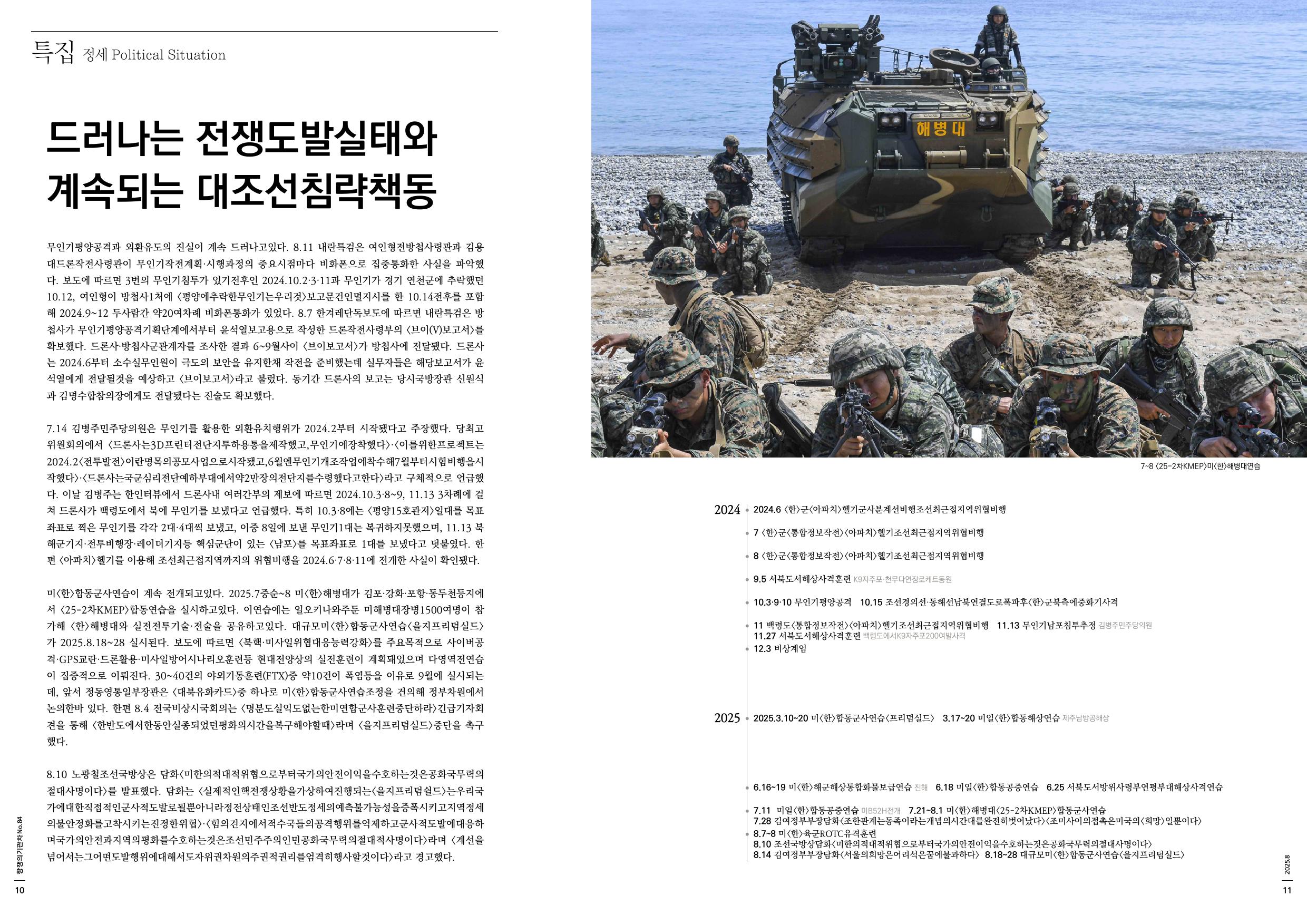 미<한>합동군사연습이 계속 전개되고있다. 2025.7중순~8 미<한>해병대가 김포·강화·포항·동두천등지에서 <25-2차KMEP>합동연습을 실시하고있다. 이연습에는 일오키나와주둔 미해병대장병1500여명이 참가해 <한>해병대와 실전전투기술·전술을 공유하고있다. 대규모미<한>합동군사연습<을지프리덤실드>가 2025.8.18~28 실시된다. 보도에 따르면 <북핵·미사일위협대응능력강화>를 주요목적으로 사이버공격·GPS교란·드론활용·미사일방어시나리오훈련등 현대전양상의 실전훈련이 계획돼있으며 다영역전연습이 집중적으로 이뤄진다. 30~40건의 야외기동훈련(FTX)중 약10건이 폭염등을 이유로 9월에 실시되는데, 앞서 정동영통일부장관은 <대북유화카드>중 하나로 미<한>합동군사연습조정을 건의해 정부차원에서 논의한바 있다. 한편 8.4 전국비상시국회의는 <명분도실익도없는한미연합군사훈련중단하라>긴급기자회견을 통해 <한반도에서한동안실종되었던평화의시간을복구해야할때>라며 <을지프리덤실드>중단을 촉구했다.