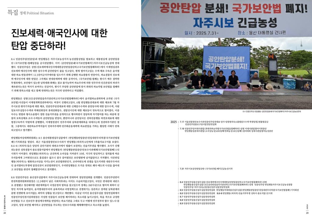 8.8 민중민주당은 용산집무실앞에서 자주시보긴급농성에 연대하며 정당연설회를 전개했다. 민중민주당반미반전특별위원회위원장은 12.3내란이 낳은 사회적후과는 아직도 수습되지않고있다, 국민은 반내란대 내란으로 분열됐고 청산돼야할 내란세력들이 국정운영의 발목을 잡고있으며 경제는 IMF수준으로 떨어져 회복이 난망인 처지에 놓여있다, 윤석열내란무리의 굴욕적외교·국방정책으로 전쟁위기는 상존하고 경색된 남북관계의 끝엔 전쟁밖에 보이지않는 최악의 상황을 맞고있다고 개탄했다. 다음날 이어진 용산집무실앞 정당연설회에서 민중민주당인천시당위원장은 각성한 민중들이 보안법 폐지하라는 목소리를 높이고있다, 북을 적으로 규정한 보안법을 두고 진보민주·통일애국세력을 탄압하는 파쇼기관을 그대로 두고 어떻게 민주정부라 할수 있느냐 묻고있다, 당장 보안법 폐지하고 공안탄압을 주도하는 안보수사과를 해체해야한다고 목소리를 높였다.