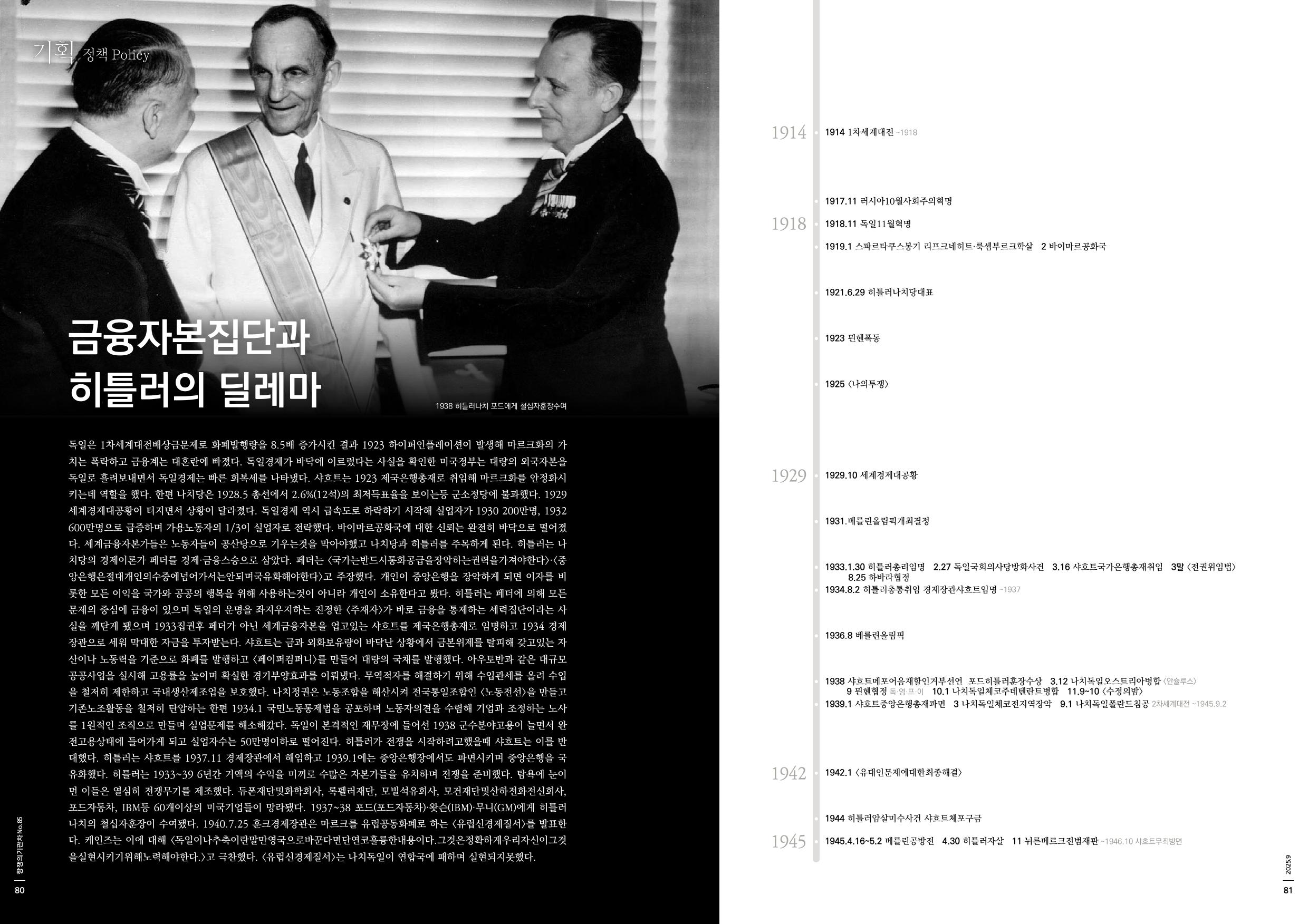 독일은 1차세계대전배상금문제로 화폐발행량을 8.5배 증가시킨 결과 1923 하이퍼인플레이션이 발생해 마르크화의 가치는 폭락하고 금융계는 대혼란에 빠졌다. 독일경제가 바닥에 이르렀다는 사실을 확인한 미국정부는 대량의 외국자본을 독일로 흘려보내면서 독일경제는 빠른 회복세를 나타냈다. 샤흐트는 1923 제국은행총재로 취임해 마르크화를 안정화시키는데 역할을 했다. 한편 나치당은 1928.5 총선에서 2.6%(12석)의 최저득표율을 보이는등 군소정당에 불과했다. 1929 세계경제대공황이 터지면서 상황이 달라졌다. 독일경제 역시 급속도로 하락하기 시작해 실업자가 1930 200만명, 1932 600만명으로 급증하며 가용노동자의 1/3이 실업자로 전락했다. 바이마르공화국에 대한 신뢰는 완전히 바닥으로 떨어졌다. 세계금융자본가들은 노동자들이 공산당으로 기우는것을 막아야했고 나치당과 히틀러를 주목하게 된다. 히틀러는 나치당의 경제이론가 페더를 경제·금융스승으로 삼았다. 페더는 <국가는반드시통화공급을장악하는권력을가져야한다>·<중앙은행은절대개인의수중에넘어가서는안되며국유화해야한다>고 주장했다. 개인이 중앙은행을 장악하게 되면 이자를 비롯한 모든 이익을 국가와 공공의 행복을 위해 사용하는것이 아니라 개인이 소유한다고 봤다. 히틀러는 페더에 의해 모든 문제의 중심에 금융이 있으며 독일의 운명을 좌지우지하는 진정한 <주재자>가 바로 금융을 통제하는 세력집단이라는 사실을 깨닫게 됐으며 1933집권후 페더가 아닌 세계금융자본을 업고있는 샤흐트를 제국은행총재로 임명하고 1934 경제장관으로 세워 막대한 자금을 투자받는다. 샤흐트는 금과 외화보유량이 바닥난 상황에서 금본위제를 탈피해 갖고있는 자산이나 노동력을 기준으로 화폐를 발행하고 <페이퍼컴퍼니>를 만들어 대량의 국채를 발행했다. 아우토반과 같은 대규모공공사업을 실시해 고용률을 높이며 확실한 경기부양효과를 이뤄냈다. 무역적자를 해결하기 위해 수입관세를 올려 수입을 철저히 제한하고 국내생산제조업을 보호했다. 나치정권은 노동조합을 해산시켜 전국통일조합인 <노동전선>을 만들고 기존노조활동을 철저히 탄압하는 한편 1934.1 국민노동통제법을 공포하며 노동자의견을 수렴해 기업과 조정하는 노사를 1원적인 조직으로 만들며 실업문제를 해소해갔다. 독일이 본격적인 재무장에 들어선 1938 군수분야고용이 늘면서 완전고용상태에 들어가게 되고 실업자수는 50만명이하로 떨어진다. 히틀러가 전쟁을 시작하려고했을때 샤흐트는 이를 반대했다. 히틀러는 샤흐트를 1937.11 경제장관에서 해임하고 1939.1에는 중앙은행장에서도 파면시키며 중앙은행을 국유화했다. 히틀러는 1933~39 6년간 거액의 수익을 미끼로 수많은 자본가들을 유치하며 전쟁을 준비했다. 탐욕에 눈이 먼 이들은 열심히 전쟁무기를 제조했다. 듀폰재단및화학회사, 록펠러재단, 모빌석유회사, 모건재단및산하전화전신회사, 포드자동차, IBM등 60개이상의 미국기업들이 망라됐다. 1937~38 포드(포드자동차)·왓슨(IBM)·무니(GM)에게 히틀러나치의 철십자훈장이 수여됐다. 1940.7.25 훈크경제장관은 마르크를 유럽공동화폐로 하는 <유럽신경제질서>를 발표한다. 케인즈는 이에 대해 <독일이나추축이란말만영국으로바꾼다면단연코훌륭한내용이다.그것은정확하게우리자신이그것을실현시키기위해노력해야한다.>고 극찬했다. <유럽신경제질서>는 나치독일이 연합국에 패하며 실현되지못했다.