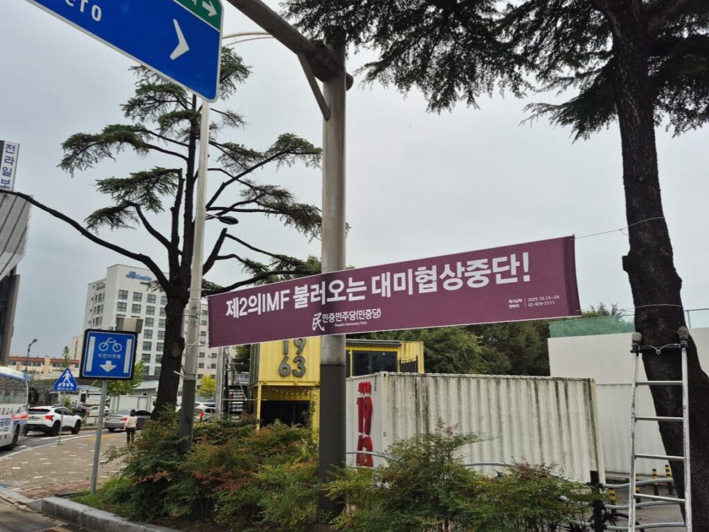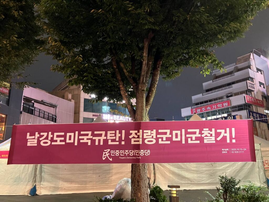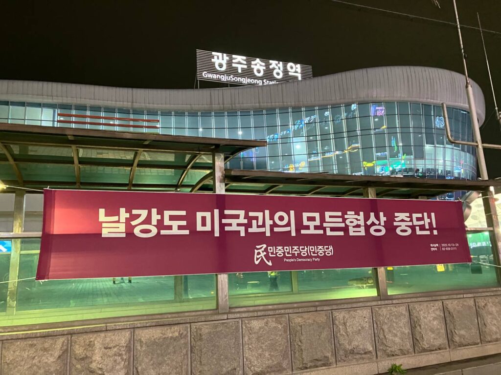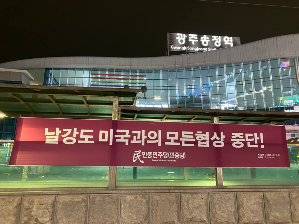 정당연설회 〈날강도 미국과의 모든협상 중단!〉 민중민주당 광주·전주 가로막게시 2025년 10월 13일 FacebookTwitter 민중민주당(민중당)은 13일 광주 광주송정역앞, 5.18민주광장, 금남로, 기아자동차1공장남문앞, 전주 풍남문광장 등에 구호 <날강도 미국과의 모든협상 중단!>, <날강도미국규탄! 점령군미군철거!>, <무제한통화스와프는 무제한통화주권상실>, <제2의IMF 불러오는 대미협상중단!> 가로막을 게시했다.