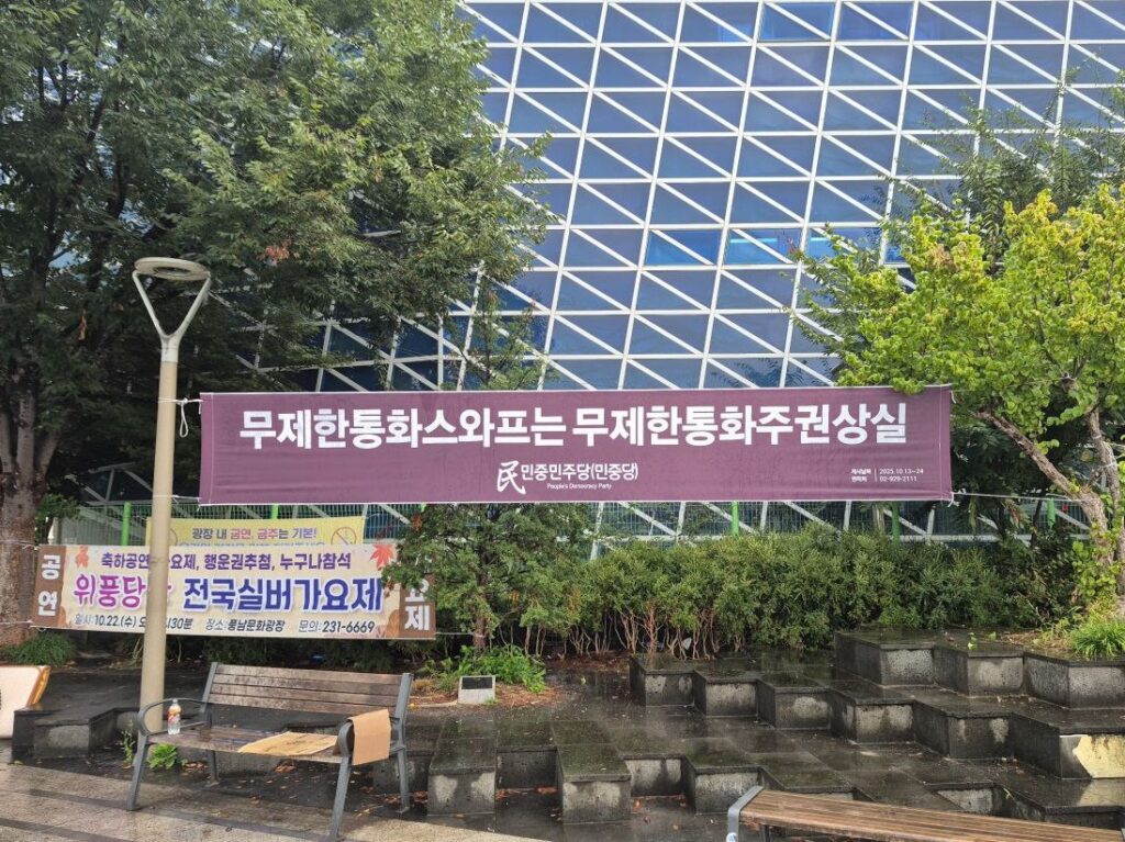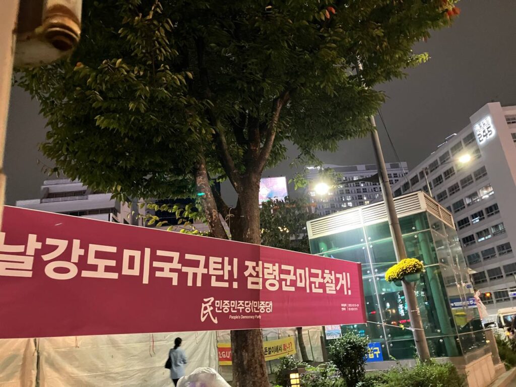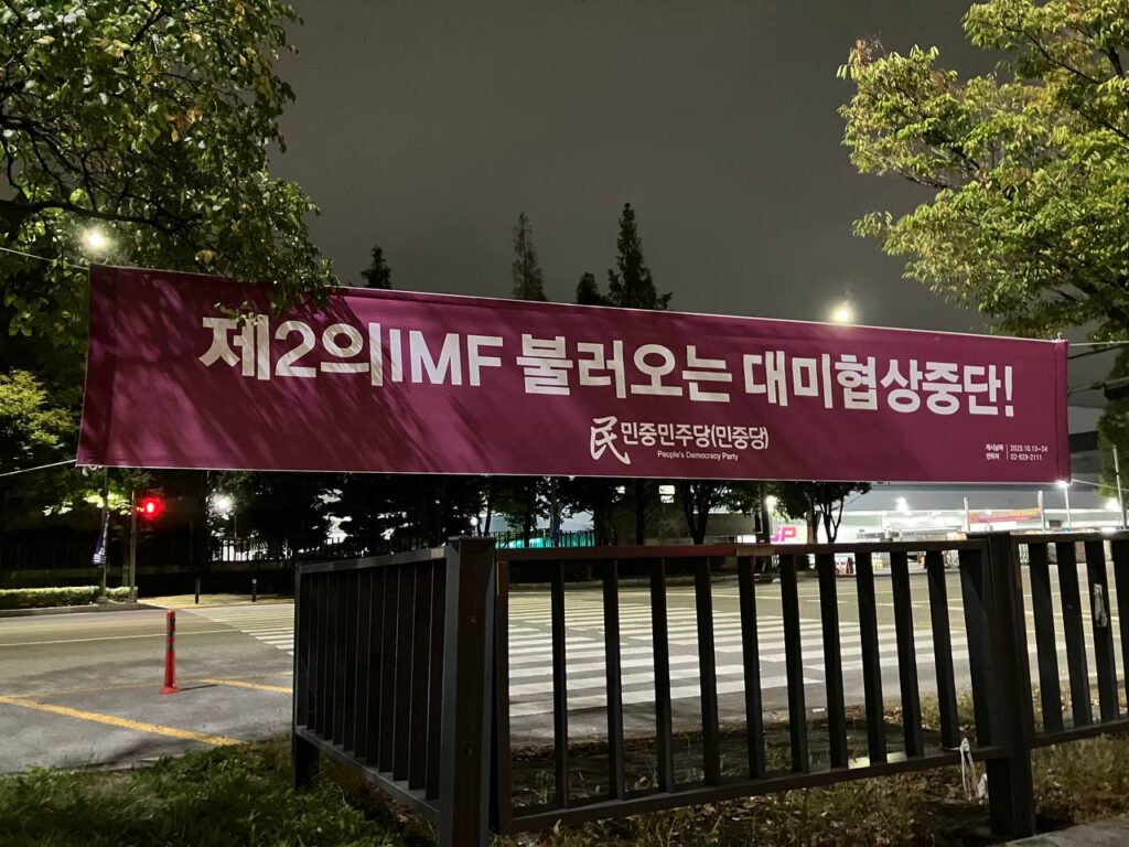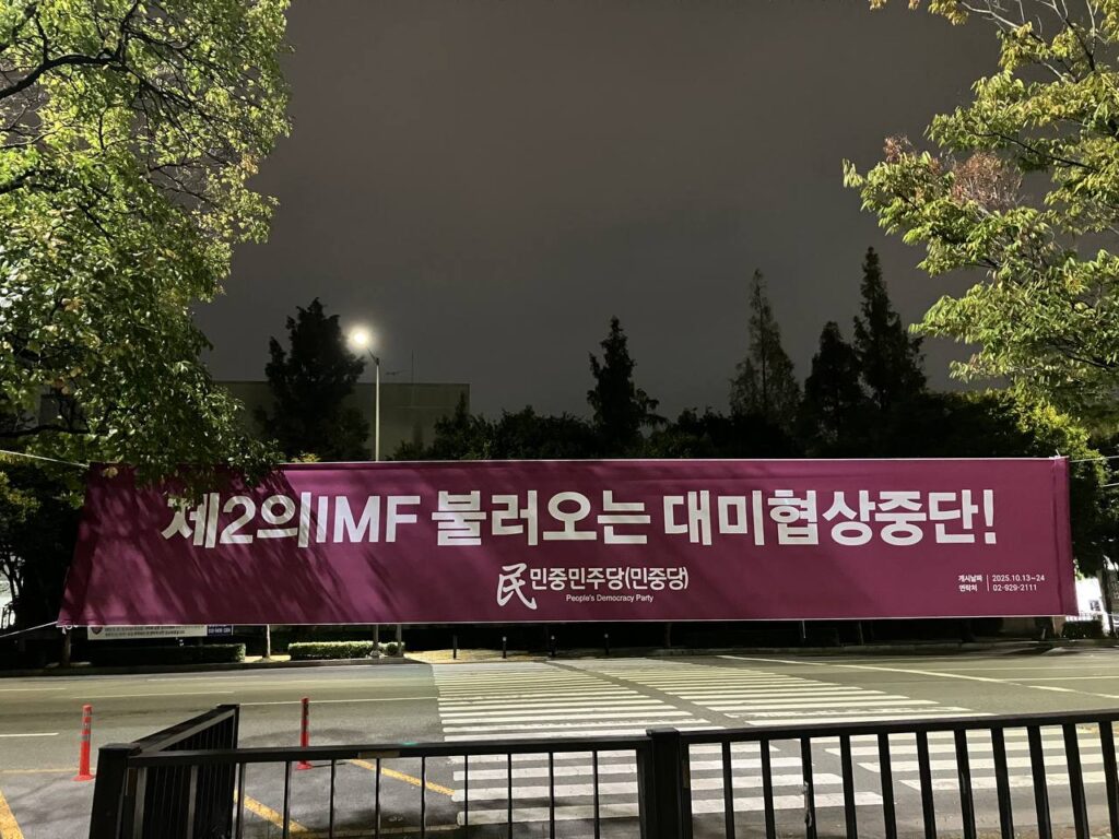 정당연설회 〈날강도 미국과의 모든협상 중단!〉 민중민주당 광주·전주 가로막게시 2025년 10월 13일 FacebookTwitter 민중민주당(민중당)은 13일 광주 광주송정역앞, 5.18민주광장, 금남로, 기아자동차1공장남문앞, 전주 풍남문광장 등에 구호 <날강도 미국과의 모든협상 중단!>, <날강도미국규탄! 점령군미군철거!>, <무제한통화스와프는 무제한통화주권상실>, <제2의IMF 불러오는 대미협상중단!> 가로막을 게시했다.