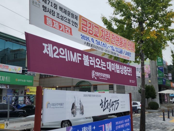 정당연설회 〈제2의IMF 불러오는 대미협상중단!〉 민중민주당 공주·부산·대구 가로막게시 2025년 10월 14일 FacebookTwitter 민중민주당(민중당)은 14일 공주 강북사거리·옥룡동, 부산 서면, 대구 유천네거리·월성사거리에 구호 <날강도미국규탄! 점령군미군철거!>, <무제한통화스와프는 무제한통화주권상실>, <제2의IMF 불러오는 대미협상중단!> 가로막을 게시했다.