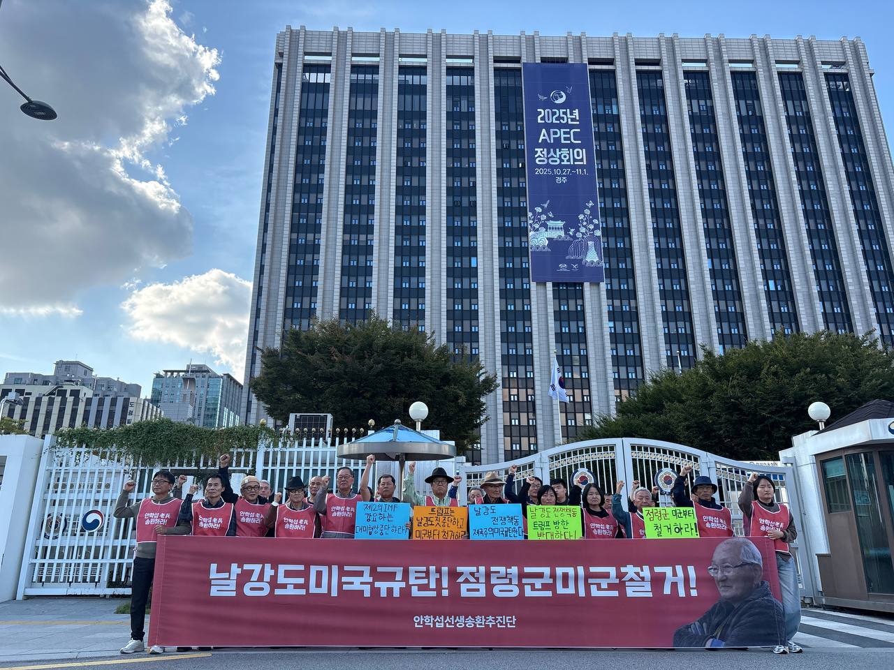 참가자들은 구호 <날강도 전쟁책동 제국주의미국 규탄한다!>, <제2의IMF 강요하는 대미협상 중단하라!>, <트럼프는 날강도짓 중단하고 미군부터 철거하라!>, <날강도 전쟁책동 트럼프방한 반대한다!>, <안학섭노병송환 가로막는 미제국주의 끝장내자!>, <안학섭선생 투쟁정신으로 반미자주 실현하자!>를 힘차게 외쳤다.