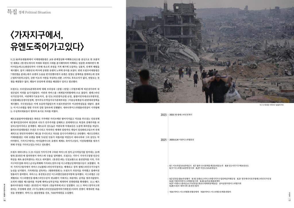 트럼프·네타냐후는 9.29 사실상 가자지구에 구축된 하마스의 정치·군사적입지를 밀어내는 20개항목<휴전안>에 합의하면서 하마스에 수용을 압박했다. 트럼프는 거부시 가자지구점령·민간인학살을 계속 용인하겠다는 의도도 내비쳤다. <휴전안>에는 인질교환으로 종전절차를 시작, 가자지구비무장화·하마스군사능력해체·가자과도정부수립·이스라엘군단계적철수등이 포함됐다. 특히 가자지구통치에서 하마스·PA(팔레스타인자치정부)는 배제되고 장차 팔레스타인국가수립가능성을 남겨뒀다. 가자재건을 감독하는 <평화위원회>는 트럼프가 의장직을 자처했고 블레어전영총리가 참여한다. 하마스는 휴전첫조건인 이스라엘인질완전석방에 동의했다. 이스라엘은 1단계협의로 이스라엘인질·팔레스타인수감자 맞교환이 이뤄지는 와중에도 공격을 멈추지않았다. 오히려 9월말 헤즈볼라를 겨냥해 레바논남부공격을 재개하며 전쟁범위를 확대했다. 10.4 헤즈볼라사무총장 카셈은 <휴전안>이 적들의 <전술적후퇴>라고 일침했다. 10.11 하마스정치국고위관리는 무장해제 관련 <무기는팔레스타인민중을방어하기위한것>이라며 전쟁이 재개되면 싸울것을 천명했다. 하마스는 총동원령을 선포, 7000여대원을 소집했다.