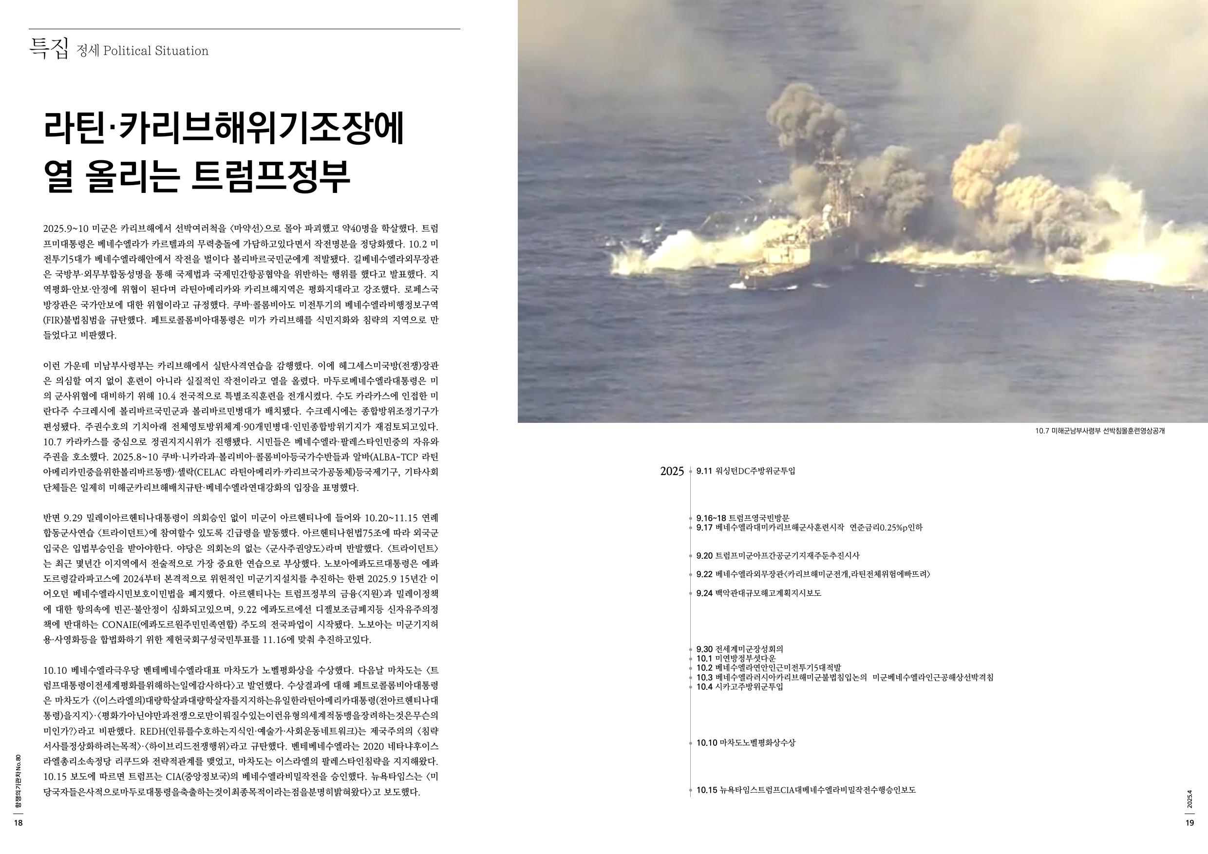 10.10 베네수엘라극우당 벤테베네수엘라대표 마차도가 노벨평화상을 수상했다. 다음날 마차도는 <트럼프대통령이전세계평화를위해하는일에감사하다>고 발언했다. 수상결과에 대해 페트로콜롬비아대통령은 마차도가 <(이스라엘의)대량학살과대량학살자를지지하는유일한라틴아메리카대통령(전아르헨티나대통령)을지지>·<평화가아닌야만과전쟁으로만이뤄질수있는이런유형의세계적동맹을장려하는것은무슨의미인가?>라고 비판했다. REDH(인류를수호하는지식인·예술가·사회운동네트워크)는 제국주의의 <침략서사를정상화하려는목적>·<하이브리드전쟁행위>라고 규탄했다. 벤테베네수엘라는 2020 네타냐후이스라엘총리소속정당 리쿠드와 전략적관계를 맺었고, 마차도는 이스라엘의 팔레스타인침략을 지지해왔다. 10.15 보도에 따르면 트럼프는 CIA(중앙정보국)의 베네수엘라비밀작전을 승인했다. 뉴욕타임스는 <미당국자들은사적으로마두로대통령을축출하는것이최종목적이라는점을분명히밝혀왔다>고 보도했다.