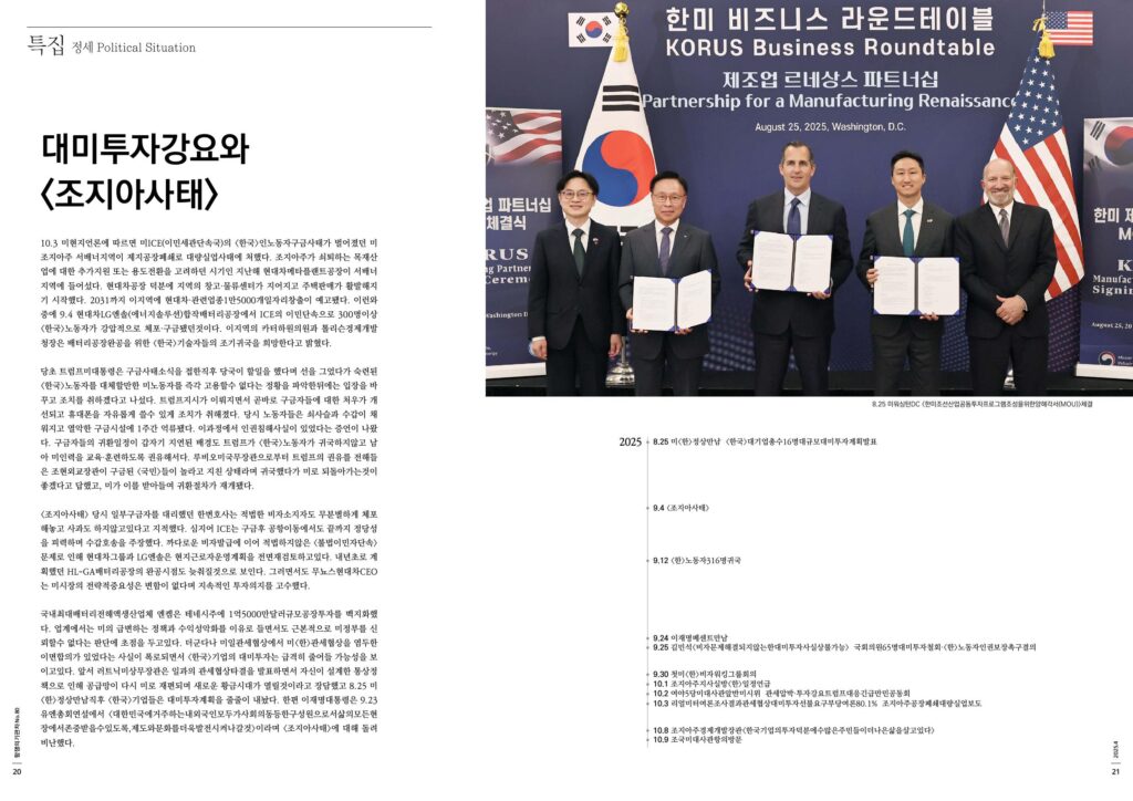 10.3 미현지언론에 따르면 미ICE(이민세관단속국)의 <한국>인노동자구금사태가 벌어졌던 미 조지아주 서배너지역이 제지공장폐쇄로 대량실업사태에 처했다. 조지아주가 쇠퇴하는 목재산업에 대한 추가지원 또는 용도전환을 고려하던 시기인 지난해 현대차메타플랜트공장이 서배너지역에 들어섰다. 현대차공장 덕분에 지역의 창고·물류센터가 지어지고 주택판매가 활발해지기 시작했다. 2031까지 이지역에 현대차·관련업종1만5000개일자리창출이 예고됐다. 이런와중에 9.4 현대차LG엔솔(에너지솔루션)합작배터리공장에서 ICE의 이민단속으로 300명이상<한국>노동자가 강압적으로 체포·구금됐던것이다. 이지역의 카터하원의원과 톨리슨경제개발청장은 배터리공장완공을 위한 <한국>기술자들의 조기귀국을 희망한다고 밝혔다.