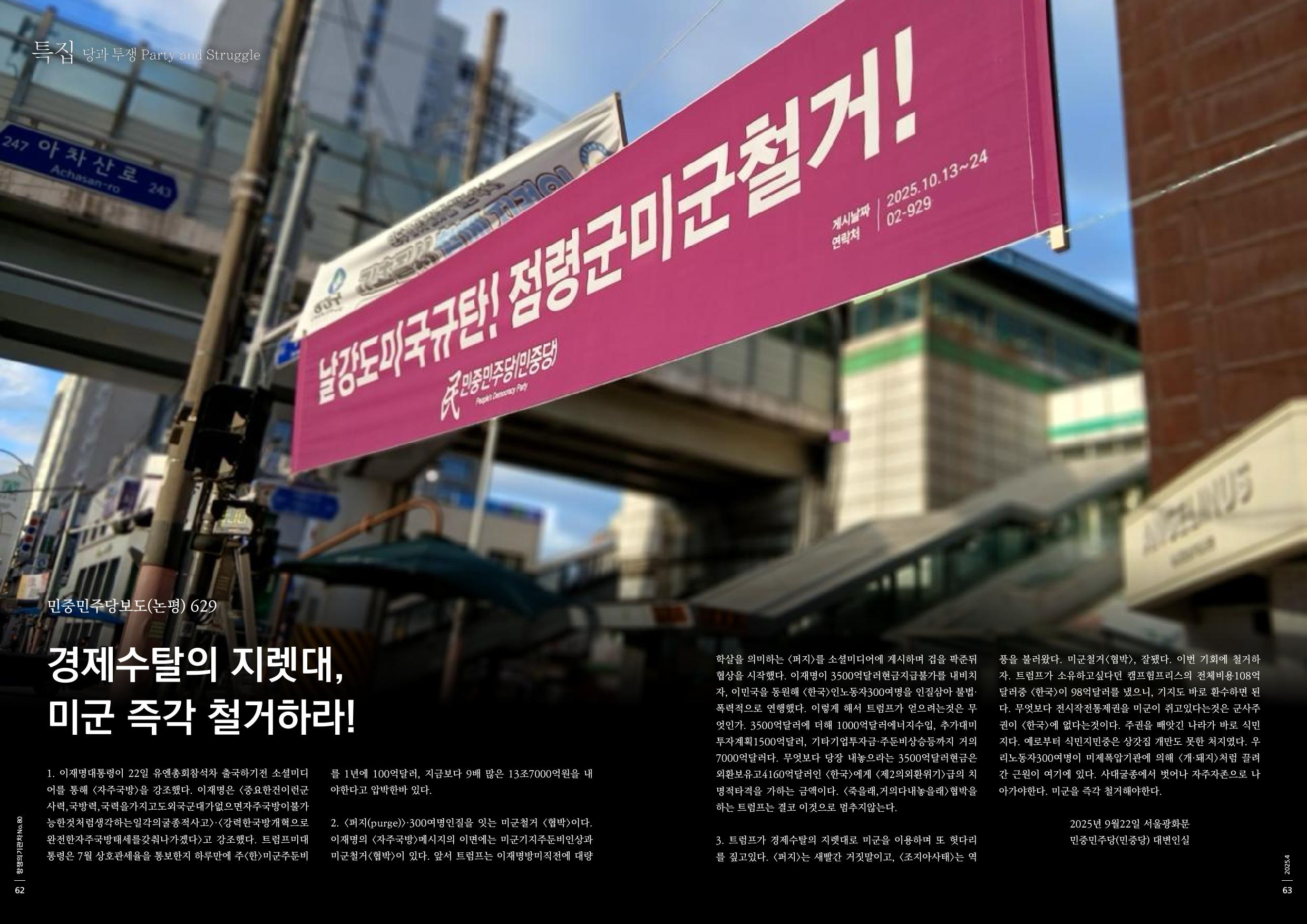 3. 트럼프가 경제수탈의 지렛대로 미군을 이용하며 또 헛다리를 짚고있다. <퍼지>는 새빨간 거짓말이고, <조지아사태>는 역풍을 불러왔다. 미군철거<협박>, 잘됐다. 이번 기회에 철거하자. 트럼프가 소유하고싶다던 캠프험프리스의 전체비용108억달러중 <한국>이 98억달러를 냈으니, 기지도 바로 환수하면 된다. 무엇보다 전시작전통제권을 미군이 쥐고있다는것은 군사주권이 <한국>에 없다는것이다. 주권을 빼앗긴 나라가 바로 식민지다. 예로부터 식민지민중은 상갓집 개만도 못한 처지였다. 우리노동자300여명이 미제폭압기관에 의해 <개·돼지>처럼 끌려간 근원이 여기에 있다. 사대굴종에서 벗어나 자주자존으로 나아가야한다. 미군을 즉각 철거해야한다.