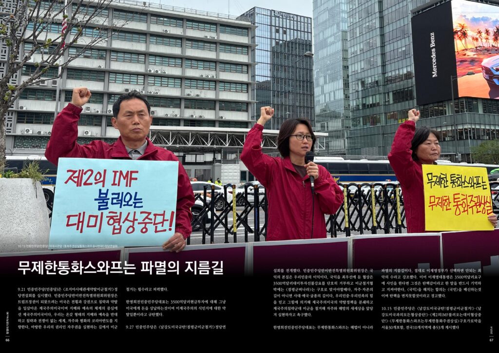 10.15 민중민주당은 <날강도미국규탄!점령군미군철거!>·<날강도미국과의모든협상중단!>·<제2의IMF불러오는대미협상중단!>·<무제한통화스와프는무제한통화주권상실>구호가로막을 서울30개포함, 전국10개지역에 총53개 게시했다.