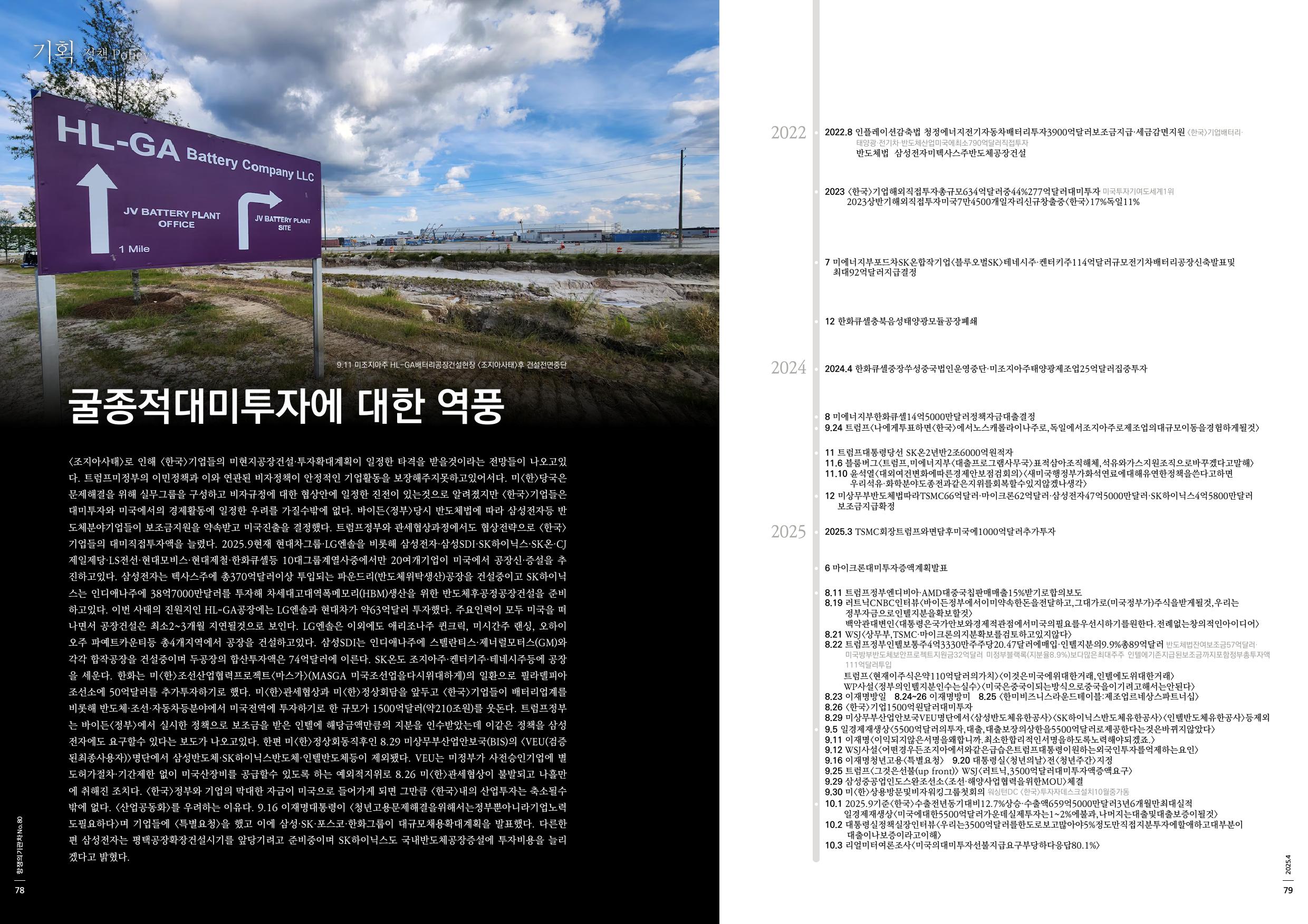 <조지아사태>로 인해 <한국>기업들의 미현지공장건설·투자확대계획이 일정한 타격을 받을것이라는 전망들이 나오고있다. 트럼프미정부의 이민정책과 이와 연관된 비자정책이 안정적인 기업활동을 보장해주지못하고있어서다. 미<한>당국은 문제해결을 위해 실무그룹을 구성하고 비자규정에 대한 협상안에 일정한 진전이 있는것으로 알려졌지만 <한국>기업들은 대미투자와 미국에서의 경제활동에 일정한 우려를 가질수밖에 없다. 바이든<정부>당시 반도체법에 따라 삼성전자등 반도체분야기업들이 보조금지원을 약속받고 미국진출을 결정했다. 트럼프정부와 관세협상과정에서도 협상전략으로 <한국>기업들의 대미직접투자액을 늘렸다. 2025.9현재 현대차그룹·LG엔솔을 비롯해 삼성전자·삼성SDI·SK하이닉스·SK온·CJ제일제당·LS전선·현대모비스·현대제철·한화큐셀등 10대그룹계열사중에서만 20여개기업이 미국에서 공장신·증설을 추진하고있다. 삼성전자는 텍사스주에 총370억달러이상 투입되는 파운드리(반도체위탁생산)공장을 건설중이고 SK하이닉스는 인디애나주에 38억7000만달러를 투자해 차세대고대역폭메모리(HBM)생산을 위한 반도체후공정공장건설을 준비하고있다. 이번 사태의 진원지인 HL-GA공장에는 LG엔솔과 현대차가 약63억달러 투자했다. 주요인력이 모두 미국을 떠나면서 공장건설은 최소2~3개월 지연될것으로 보인다. LG엔솔은 이외에도 애리조나주 퀸크릭, 미시간주 랜싱, 오하이오주 파예트카운티등 총4개지역에서 공장을 건설하고있다. 삼성SDI는 인디애나주에 스텔란티스·제너럴모터스(GM)와 각각 합작공장을 건설중이며 두공장의 합산투자액은 74억달러에 이른다. SK온도 조지아주·켄터키주·테네시주등에 공장을 세운다. 한화는 미<한>조선산업협력프로젝트<마스가>(MASGA 미국조선업을다시위대하게)의 일환으로 필라델피아 조선소에 50억달러를 추가투자하기로 했다. 미<한>관세협상과 미<한>정상회담을 앞두고 <한국>기업들이 배터리업계를 비롯해 반도체·조선·자동차등분야에서 미국전역에 투자하기로 한 규모가 1500억달러(약210조원)를 웃돈다. 트럼프정부는 바이든<정부>에서 실시한 정책으로 보조금을 받은 인텔에 해당금액만큼의 지분을 인수받았는데 이같은 정책을 삼성전자에도 요구할수 있다는 보도가 나오고있다. 한편 미<한>정상회동직후인 8.29 미상무부산업안보국(BIS)의 <VEU(검증된최종사용자)>명단에서 삼성반도체·SK하이닉스반도체·인텔반도체등이 제외됐다. VEU는 미정부가 사전승인기업에 별도허가절차·기간제한 없이 미국산장비를 공급할수 있도록 하는 예외적지위로 8.26 미<한>관세협상이 불발되고 나흘만에 취해진 조치다. <한국>정부와 기업의 막대한 자금이 미국으로 들어가게 되면 그만큼 <한국>내의 산업투자는 축소될수밖에 없다. <산업공동화>를 우려하는 이유다. 9.16 이재명대통령이 <청년고용문제해결을위해서는정부뿐아니라기업노력도필요하다>며 기업들에 <특별요청>을 했고 이에 삼성·SK·포스코·한화그룹이 대규모채용확대계획을 발표했다. 다른한편 삼성전자는 평택공장확장건설시기를 앞당기려고 준비중이며 SK하이닉스도 국내반도체공장증설에 투자비용을 늘리겠다고 밝혔다.