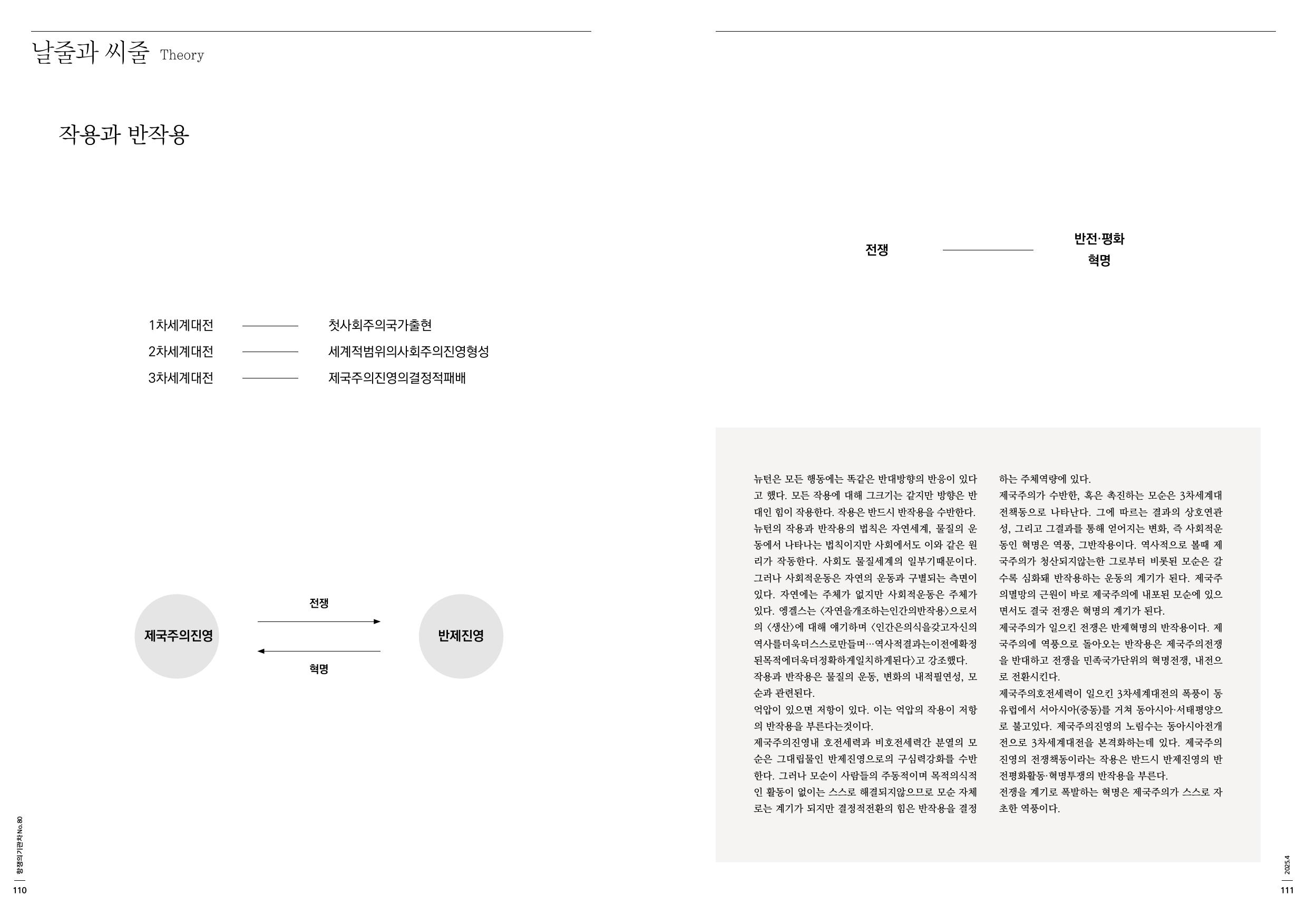 제국주의호전세력이 일으킨 3차세계대전의 폭풍이 동유럽에서 서아시아(중동)를 거쳐 동아시아·서태평양으로 불고있다. 제국주의진영의 노림수는 동아시아전개전으로 3차세계대전을 본격화하는데 있다. 제국주의진영의 전쟁책동이라는 작용은 반드시 반제진영의 반전평화활동·혁명투쟁의 반작용을 부른다.