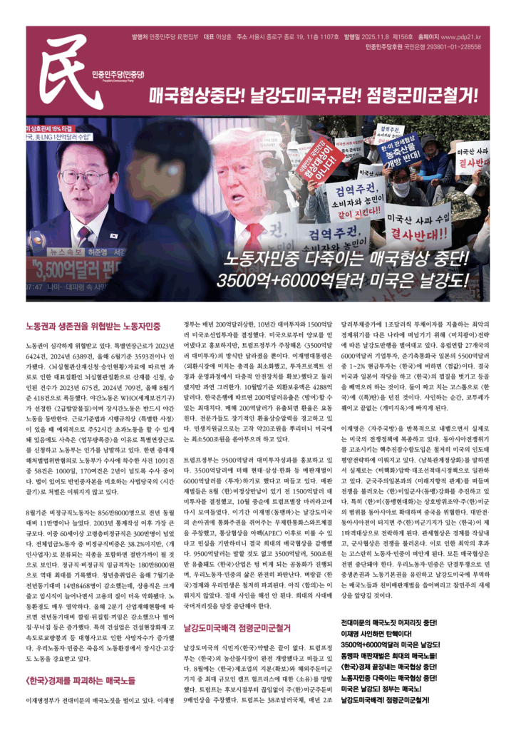 3. 경제를 말아먹고 민생을 파괴하며 전쟁을 불러오고 있다. 500조원을 국내에 투자하면 500만개 양질의 일자리가 생기고 4인가족기준 2000만명의 생계가 보장된다. 반면 1350조원유출에 따른 산업공동화는 우리노동자에게 실업·저질일자리를 강요한다. 이재명정부가 <성과>로 내세우는 엔비디아GPU 26만장확보는 민중기만의 실체며, 이마저도 트럼프는 <수출통제>를 시사하고 있다. 또 다른 <성과>라는 핵추진잠수함은 미국의 인도태평양전략에 따른 것으로 <자주국방>이 아닌 <예속국방>의 산물이다. 아펙(APEC)기간 나토회원국 캐나다와 비밀정보보호협정을 체결하고 동아시아전돌격대 일군국주의와 결탁을 강화한 것은 이재명의 대외정책이 파쇼호전광 윤석열과 똑같다는 것을 보여준다. 이재명정권이 저지른 전대미문의 사대매국, 민중배신을 우리노동자·민중은 결코 묵과하지 않을 것이다. 우리노동자·민중은 단결투쟁으로 모든 매국노들을 쓸어버리고 노동자·민중이 주인되는 참세상을 앞당길 것이다.