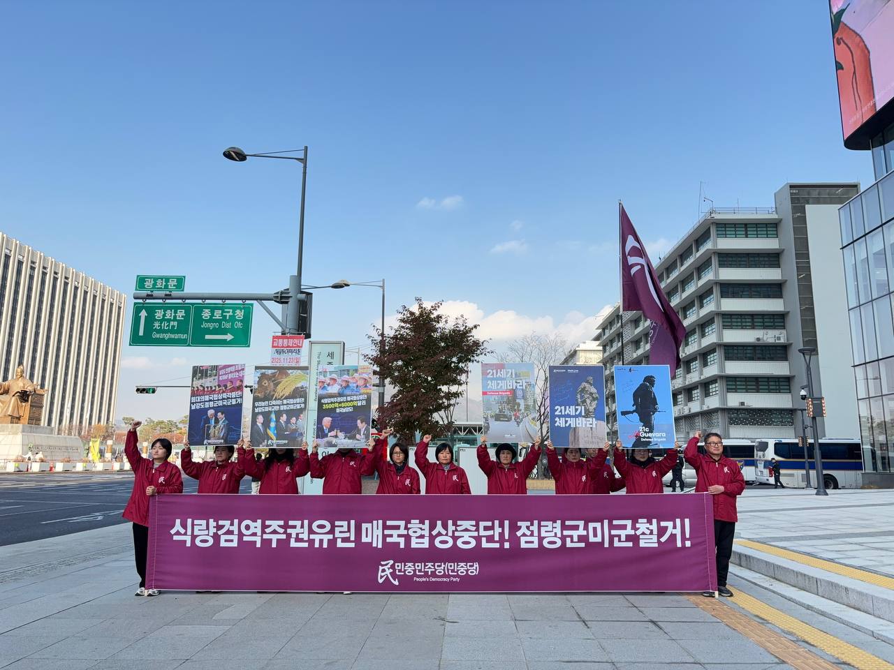 전국농민대회가 열리는 가운데 22일 민중민주당(민중당)은 미대사관앞에서 <식량검역주권유린 매국협상중단! 점령군미군철거!> 정당연설회를 전개했다.