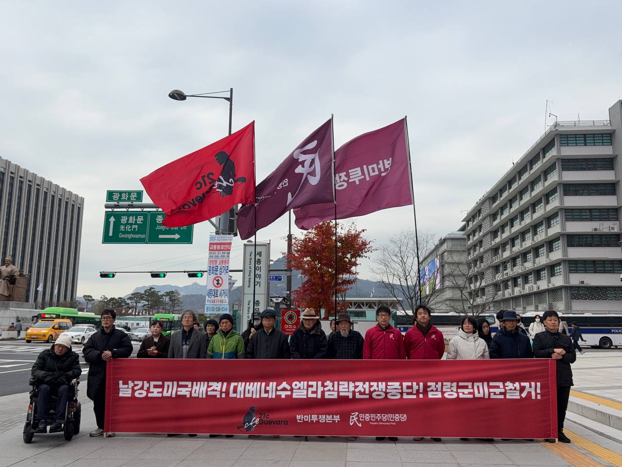 민중민주당서울시당위원장은 <제국주의는 전세계 전쟁의 원흉이다. 베네수엘라에 대한 침략이 본격화되는 배경에도 3차세계대전을 확대시키려는 제국주의의 의도가 있다. 이른바 <동맹국>이라는 친미국가를 상대로는 날강도짓을 하고 있으며, 반제민중정권에 대해서는 군사적 위협을 가하는 미국은 제국주의수괴다.>라고 규탄했다.
