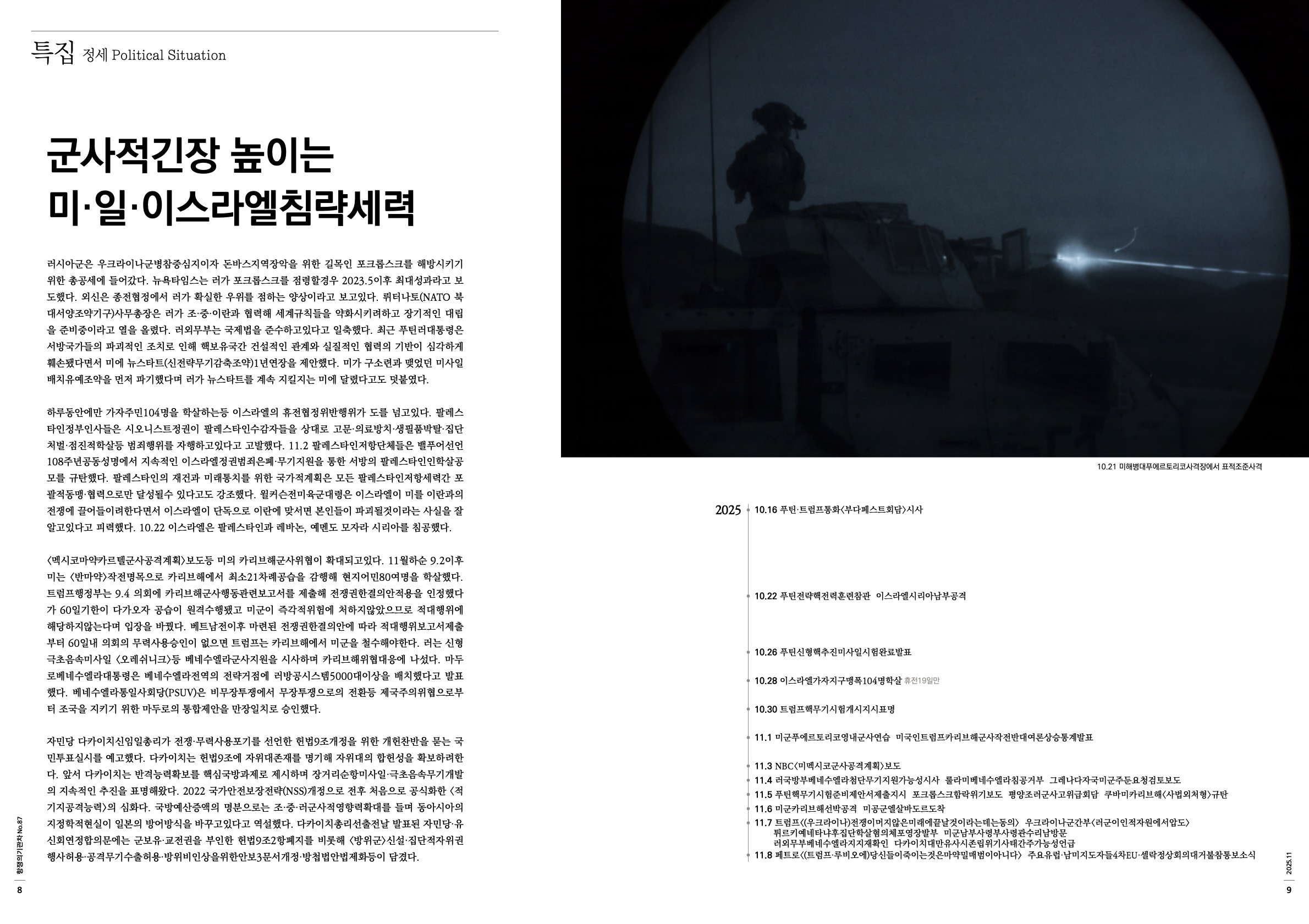 하루동안에만 가자주민104명을 학살하는등 이스라엘의 휴전협정위반행위가 도를 넘고있다. 팔레스타인정부인사들은 시오니스트정권이 팔레스타인수감자들을 상대로 고문·의료방치·생필품박탈·집단처벌·점진적학살등 범죄행위를 자행하고있다고 고발했다. 11.2 팔레스타인저항단체들은 밸푸어선언108주년공동성명에서 지속적인 이스라엘정권범죄은폐·무기지원을 통한 서방의 팔레스타인인학살공모를 규탄했다. 팔레스타인의 재건과 미래통치를 위한 국가적계획은 모든 팔레스타인저항세력간 포괄적동맹·협력으로만 달성될수 있다고도 강조했다. 윌커슨전미육군대령은 이스라엘이 미를 이란과의 전쟁에 끌어들이려한다면서 이스라엘이 단독으로 이란에 맞서면 본인들이 파괴될것이라는 사실을 잘 알고있다고 피력했다. 10.22 이스라엘은 팔레스타인과 레바논, 예멘도 모자라 시리아를 침공했다.